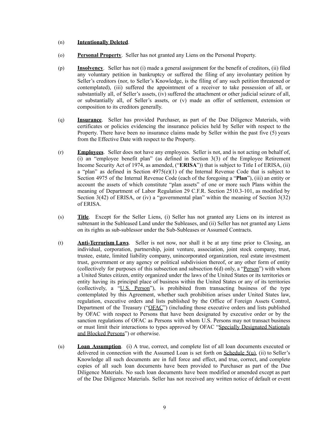 (n)​ Intentionally Deleted. (o)​ Personal Property. Seller has not granted any Liens on the Personal Property. (p)​ Insolvency. Seller has not (i) made a general assignment for the benefit of creditors, (ii) filed any voluntary petition in bankruptcy or suffered the filing of any involuntary petition by Seller’s creditors (nor, to Seller’s Knowledge, is the filing of any such petition threatened or contemplated), (iii) suffered the appointment of a receiver to take possession of all, or substantially all, of Seller’s assets, (iv) suffered the attachment or other judicial seizure of all, or substantially all, of Seller’s assets, or (v) made an offer of settlement, extension or composition to its creditors generally. (q)​ Insurance. Seller has provided Purchaser, as part of the Due Diligence Materials, with certificates or policies evidencing the insurance policies held by Seller with respect to the Property. There have been no insurance claims made by Seller within the past five (5) years from the Effective Date with respect to the Property. (r)​ Employees. Seller does not have any employees. Seller is not, and is not acting on behalf of, (i) an “employee benefit plan” (as defined in Section 3(3) of the Employee Retirement Income Security Act of 1974, as amended, (“ERISA”)) that is subject to Title I of ERISA, (ii) a “plan” as defined in Section 4975(e)(1) of the Internal Revenue Code that is subject to Section 4975 of the Internal Revenue Code (each of the foregoing a “Plan”), (iii) an entity or account the assets of which constitute “plan assets” of one or more such Plans within the meaning of Department of Labor Regulation 29 C.F.R. Section 2510.3-101, as modified by Section 3(42) of ERISA, or (iv) a “governmental plan” within the meaning of Section 3(32) of ERISA. (s)​ Title. Except for the Seller Liens, (i) Seller has not granted any Liens on its interest as subtenant in the Subleased Land under the Subleases, and (ii) Seller has not granted any Liens on its rights as sub-sublessor under the Sub-Subleases or Assumed Contracts. (t)​ Anti-Terrorism Laws.​ Seller is not now, nor shall it be at any time prior to Closing, an individual, corporation, partnership, joint venture, association, joint stock company, trust, trustee, estate, limited liability company, unincorporated organization, real estate investment trust, government or any agency or political subdivision thereof, or any other form of entity (collectively for purposes of this subsection and subsection 6(d) only, a “Person”) with whom a United States citizen, entity organized under the laws of the United States or its territories or entity having its principal place of business within the United States or any of its territories (collectively, a “U.S. Person”), is prohibited from transacting business of the type contemplated by this Agreement, whether such prohibition arises under United States law, regulation, executive orders and lists published by the Office of Foreign Assets Control, Department of the Treasury (“OFAC”) (including those executive orders and lists published by OFAC with respect to Persons that have been designated by executive order or by the sanction regulations of OFAC as Persons with whom U.S. Persons may not transact business or must limit their interactions to types approved by OFAC “Specially Designated Nationals and Blocked Persons”) or otherwise. (u)​ Loan Assumption. (i) A true, correct, and complete list of all loan documents executed or delivered in connection with the Assumed Loan is set forth on Schedule 5(u), (ii) to Seller’s Knowledge all such documents are in full force and effect, and true, correct, and complete copies of all such loan documents have been provided to Purchaser as part of the Due Diligence Materials. No such loan documents have been modified or amended except as part of the Due Diligence Materials. Seller has not received any written notice of default or event 9