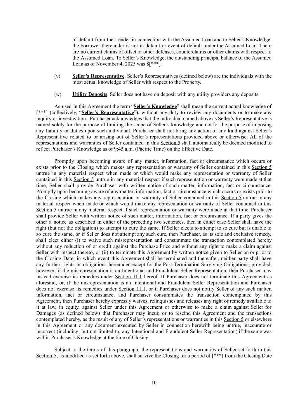 of default from the Lender in connection with the Assumed Loan and to Seller’s Knowledge, the borrower thereunder is not in default or event of default under the Assumed Loan. There are no current claims of offset or other defenses, counterclaims or other claims with respect to the Assumed Loan. To Seller’s Knowledge, the outstanding principal balance of the Assumed Loan as of November 4, 2025 was $[***]. (v)​ Seller’s Representative. Seller’s Representatives (defined below) are the individuals with the most actual knowledge of Seller with respect to the Property. (w)​ Utility Deposits. Seller does not have on deposit with any utility providers any deposits. As used in this Agreement the term “Seller’s Knowledge” shall mean the current actual knowledge of [***] (collectively, “Seller’s Representative”), without any duty to review any documents or to make any inquiry or investigation. Purchaser acknowledges that the individual named above as Seller’s Representative is named solely for the purpose of limiting the scope of Seller’s knowledge and not for the purpose of imposing any liability or duties upon such individual. Purchaser shall not bring any action of any kind against Seller’s Representative related to or arising out of Seller’s representations provided above or otherwise. All of the representations and warranties of Seller contained in this Section 5 shall automatically be deemed modified to reflect Purchaser’s Knowledge as of 9:45 a.m. (Pacific Time) on the Effective Date. Promptly upon becoming aware of any matter, information, fact or circumstance which occurs or exists prior to the Closing which makes any representation or warranty of Seller contained in this Section 5 untrue in any material respect when made or which would make any representation or warranty of Seller contained in this Section 5 untrue in any material respect if such representation or warranty were made at that time, Seller shall provide Purchaser with written notice of such matter, information, fact or circumstance. Promptly upon becoming aware of any matter, information, fact or circumstance which occurs or exists prior to the Closing which makes any representation or warranty of Seller contained in this Section 5 untrue in any material respect when made or which would make any representation or warranty of Seller contained in this Section 5 untrue in any material respect if such representation or warranty were made at that time, Purchaser shall provide Seller with written notice of such matter, information, fact or circumstance. If a party gives the other a notice as described in either of the preceding two sentences, then in either case Seller shall have the right (but not the obligation) to attempt to cure the same. If Seller elects to attempt to so cure but is unable to so cure the same, or if Seller does not attempt any such cure, then Purchaser, as its sole and exclusive remedy, shall elect either (i) to waive such misrepresentation and consummate the transaction contemplated hereby without any reduction of or credit against the Purchase Price and without any right to make a claim against Seller with respect thereto, or (ii) to terminate this Agreement by written notice given to Seller on or prior to the Closing Date, in which event this Agreement shall be terminated and thereafter, neither party shall have any further rights or obligations hereunder except for the Post-Termination Surviving Obligations; provided, however, if the misrepresentation is an Intentional and Fraudulent Seller Representation, then Purchaser may instead exercise its remedies under Section 11.1 hereof. If Purchaser does not terminate this Agreement as aforesaid, or, if the misrepresentation is an Intentional and Fraudulent Seller Representation and Purchaser does not exercise its remedies under Section 11.1, or if Purchaser does not notify Seller of any such matter, information, fact or circumstance, and Purchaser consummates the transaction contemplated by this Agreement, then Purchaser hereby expressly waives, relinquishes and releases any right or remedy available to it at law, in equity, against Seller under this Agreement or otherwise to make a claim against Seller for Damages (as defined below) that Purchaser may incur, or to rescind this Agreement and the transactions contemplated hereby, as the result of any of Seller’s representations or warranties in this Section 5 or elsewhere in this Agreement or any document executed by Seller in connection herewith being untrue, inaccurate or incorrect (including, but not limited to, any Intentional and Fraudulent Seller Representation) if the same was within Purchaser’s Knowledge at the time of Closing. Subject to the terms of this paragraph, the representations and warranties of Seller set forth in this Section 5, as modified as set forth above, shall survive the Closing for a period of [***] from the Closing Date 10