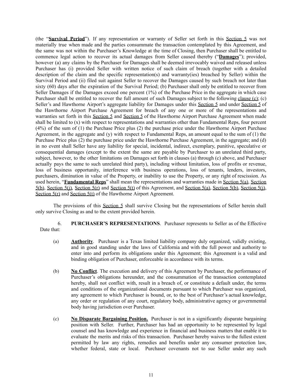 (the “Survival Period”). If any representation or warranty of Seller set forth in this Section 5 was not materially true when made and the parties consummate the transaction contemplated by this Agreement, and the same was not within the Purchaser’s Knowledge at the time of Closing, then Purchaser shall be entitled to commence legal action to recover its actual damages from Seller caused thereby (“Damages”); provided, however (a) any claims by the Purchaser for Damages shall be deemed irrevocably waived and released unless Purchaser has (i) provided Seller with written notice of such claim of breach (together with a detailed description of the claim and the specific representation(s) and warranty(ies) breached by Seller) within the Survival Period and (ii) filed suit against Seller to recover the Damages caused by such breach not later than sixty (60) days after the expiration of the Survival Period; (b) Purchaser shall only be entitled to recover from Seller Damages if the Damages exceed one percent (1%) of the Purchase Price in the aggregate in which case Purchaser shall be entitled to recover the full amount of such Damages subject to the following clause (c); (c) Seller’s and Hawthorne Airport’s aggregate liability for Damages under this Section 5 and under Section 5 of the Hawthorne Airport Purchase Agreement for breach of any one or more of the representations and warranties set forth in this Section 5 and Section 5 of the Hawthorne Airport Purchase Agreement when made shall be limited to (x) with respect to representations and warranties other than Fundamental Reps, four percent (4%) of the sum of (1) the Purchase Price plus (2) the purchase price under the Hawthorne Airport Purchase Agreement, in the aggregate and (y) with respect to Fundamental Reps, an amount equal to the sum of (1) the Purchase Price plus (2) the purchase price under the Hawthorne Purchase Agreement, in the aggregate; and (d) in no event shall Seller have any liability for special, incidental, indirect, exemplary, punitive, speculative or consequential damages (except to the extent the same are payable by Purchaser to an unrelated third party, subject, however, to the other limitations on Damages set forth in clauses (a) through (c) above, and Purchaser actually pays the same to such unrelated third party), including without limitation, loss of profits or revenue, loss of business opportunity, interference with business operations, loss of tenants, lenders, investors, purchasers, diminution in value of the Property, or inability to use the Property, or any right of rescission. As used herein, “Fundamental Reps” shall mean the representations and warranties made in Section 5(a), Section 5(b), Section 5(j), Section 5(r) and Section 5(t) of this Agreement, and Section 5(a), Section 5(b), Section 5(j), Section 5(r) and Section 5(t) of the Hawthorne Airport Agreement. The provisions of this Section 5 shall survive Closing but the representations of Seller herein shall only survive Closing as and to the extent provided herein. 6.​ PURCHASER’S REPRESENTATIONS. Purchaser represents to Seller as of the Effective Date that: (a)​ Authority. Purchaser is a Texas limited liability company duly organized, validly existing, and in good standing under the laws of California and with the full power and authority to enter into and perform its obligations under this Agreement; this Agreement is a valid and binding obligation of Purchaser, enforceable in accordance with its terms. (b)​ No Conflict. The execution and delivery of this Agreement by Purchaser, the performance of Purchaser’s obligations hereunder, and the consummation of the transaction contemplated hereby, shall not conflict with, result in a breach of, or constitute a default under, the terms and conditions of the organizational documents pursuant to which Purchaser was organized, any agreement to which Purchaser is bound, or, to the best of Purchaser’s actual knowledge, any order or regulation of any court, regulatory body, administrative agency or governmental body having jurisdiction over Purchaser. (c)​ No Disparate Bargaining Position. Purchaser is not in a significantly disparate bargaining position with Seller. Further, Purchaser has had an opportunity to be represented by legal counsel and has knowledge and experience in financial and business matters that enable it to evaluate the merits and risks of this transaction. Purchaser hereby waives to the fullest extent permitted by law any rights, remedies and benefits under any consumer protection law, whether federal, state or local. Purchaser covenants not to sue Seller under any such 11