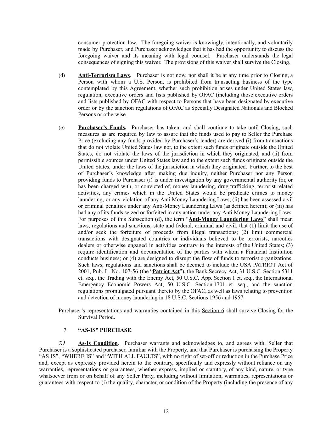 consumer protection law. The foregoing waiver is knowingly, intentionally, and voluntarily made by Purchaser, and Purchaser acknowledges that it has had the opportunity to discuss the foregoing waiver and its meaning with legal counsel. Purchaser understands the legal consequences of signing this waiver. The provisions of this waiver shall survive the Closing. (d)​ Anti-Terrorism Laws.​ Purchaser is not now, nor shall it be at any time prior to Closing, a Person with whom a U.S. Person, is prohibited from transacting business of the type contemplated by this Agreement, whether such prohibition arises under United States law, regulation, executive orders and lists published by OFAC (including those executive orders and lists published by OFAC with respect to Persons that have been designated by executive order or by the sanction regulations of OFAC as Specially Designated Nationals and Blocked Persons or otherwise. (e)​ Purchaser’s Funds. Purchaser has taken, and shall continue to take until Closing, such measures as are required by law to assure that the funds used to pay to Seller the Purchase Price (excluding any funds provided by Purchaser’s lender) are derived (i) from transactions that do not violate United States law nor, to the extent such funds originate outside the United States, do not violate the laws of the jurisdiction in which they originated; and (ii) from permissible sources under United States law and to the extent such funds originate outside the United States, under the laws of the jurisdiction in which they originated. Further, to the best of Purchaser’s knowledge after making due inquiry, neither Purchaser nor any Person providing funds to Purchaser (i) is under investigation by any governmental authority for, or has been charged with, or convicted of, money laundering, drug trafficking, terrorist related activities, any crimes which in the United States would be predicate crimes to money laundering, or any violation of any Anti Money Laundering Laws; (ii) has been assessed civil or criminal penalties under any Anti-Money Laundering Laws (as defined herein); or (iii) has had any of its funds seized or forfeited in any action under any Anti Money Laundering Laws. For purposes of this Subsection (d), the term “Anti-Money Laundering Laws” shall mean laws, regulations and sanctions, state and federal, criminal and civil, that (1) limit the use of and/or seek the forfeiture of proceeds from illegal transactions; (2) limit commercial transactions with designated countries or individuals believed to be terrorists, narcotics dealers or otherwise engaged in activities contrary to the interests of the United States; (3) require identification and documentation of the parties with whom a Financial Institution conducts business; or (4) are designed to disrupt the flow of funds to terrorist organizations. Such laws, regulations and sanctions shall be deemed to include the USA PATRIOT Act of 2001, Pub. L. No. 107-56 (the “Patriot Act”), the Bank Secrecy Act, 31 U.S.C. Section 5311 et. seq., the Trading with the Enemy Act, 50 U.S.C. App. Section 1 et. seq., the International Emergency Economic Powers Act, 50 U.S.C. Section 1701 et. seq., and the sanction regulations promulgated pursuant thereto by the OFAC, as well as laws relating to prevention and detection of money laundering in 18 U.S.C. Sections 1956 and 1957. Purchaser’s representations and warranties contained in this Section 6 shall survive Closing for the Survival Period. 7.​ “AS-IS” PURCHASE. 7.1​ As-Is Condition. Purchaser warrants and acknowledges to, and agrees with, Seller that Purchaser is a sophisticated purchaser, familiar with the Property, and that Purchaser is purchasing the Property “AS IS”, “WHERE IS” and “WITH ALL FAULTS”, with no right of set-off or reduction in the Purchase Price and, except as expressly provided herein to the contrary, specifically and expressly without reliance on any warranties, representations or guarantees, whether express, implied or statutory, of any kind, nature, or type whatsoever from or on behalf of any Seller Party, including without limitation, warranties, representations or guarantees with respect to (i) the quality, character, or condition of the Property (including the presence of any 12