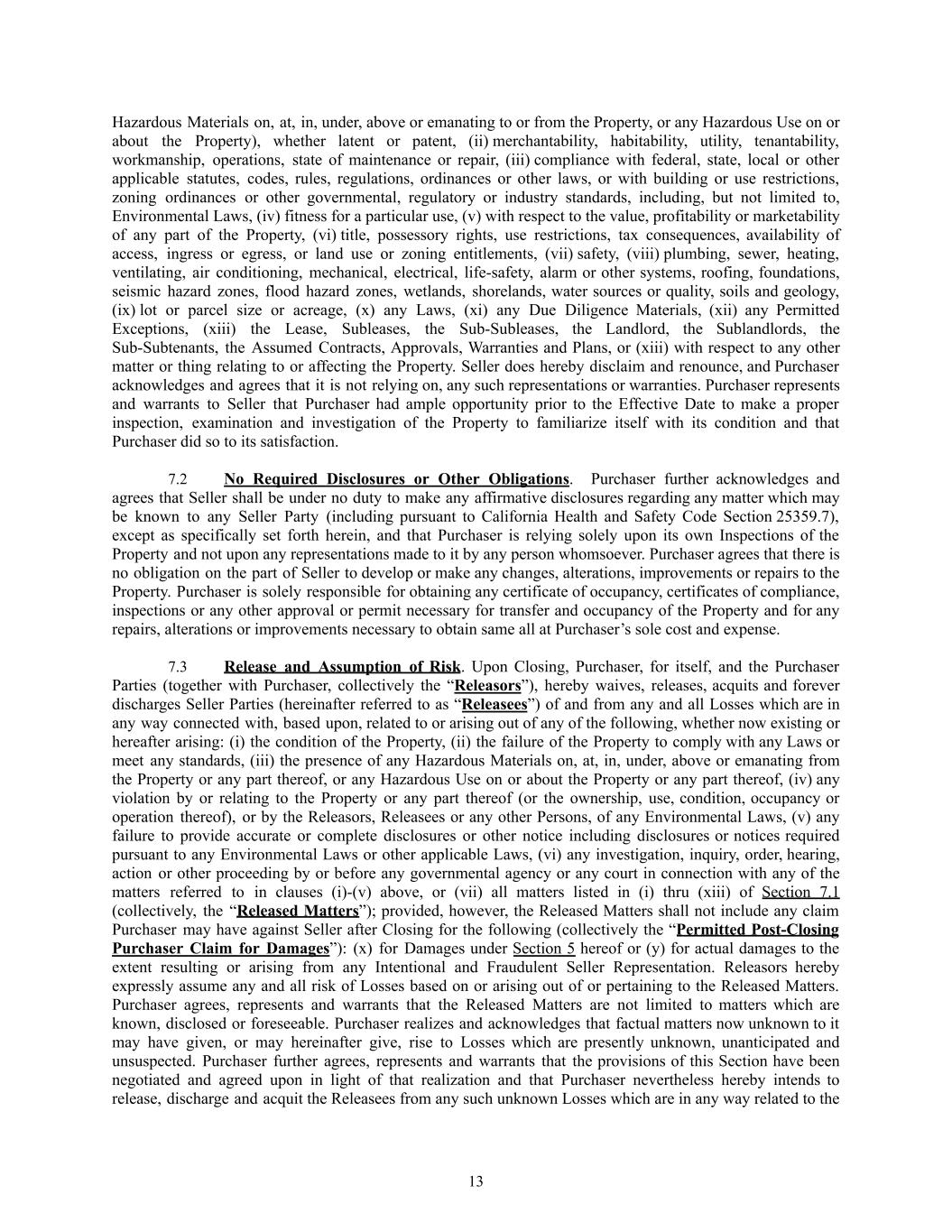 Hazardous Materials on, at, in, under, above or emanating to or from the Property, or any Hazardous Use on or about the Property), whether latent or patent, (ii) merchantability, habitability, utility, tenantability, workmanship, operations, state of maintenance or repair, (iii) compliance with federal, state, local or other applicable statutes, codes, rules, regulations, ordinances or other laws, or with building or use restrictions, zoning ordinances or other governmental, regulatory or industry standards, including, but not limited to, Environmental Laws, (iv) fitness for a particular use, (v) with respect to the value, profitability or marketability of any part of the Property, (vi) title, possessory rights, use restrictions, tax consequences, availability of access, ingress or egress, or land use or zoning entitlements, (vii) safety, (viii) plumbing, sewer, heating, ventilating, air conditioning, mechanical, electrical, life-safety, alarm or other systems, roofing, foundations, seismic hazard zones, flood hazard zones, wetlands, shorelands, water sources or quality, soils and geology, (ix) lot or parcel size or acreage, (x) any Laws, (xi) any Due Diligence Materials, (xii) any Permitted Exceptions, (xiii) the Lease, Subleases, the Sub-Subleases, the Landlord, the Sublandlords, the Sub-Subtenants, the Assumed Contracts, Approvals, Warranties and Plans, or (xiii) with respect to any other matter or thing relating to or affecting the Property. Seller does hereby disclaim and renounce, and Purchaser acknowledges and agrees that it is not relying on, any such representations or warranties. Purchaser represents and warrants to Seller that Purchaser had ample opportunity prior to the Effective Date to make a proper inspection, examination and investigation of the Property to familiarize itself with its condition and that Purchaser did so to its satisfaction. 7.2​ No Required Disclosures or Other Obligations. Purchaser further acknowledges and agrees that Seller shall be under no duty to make any affirmative disclosures regarding any matter which may be known to any Seller Party (including pursuant to California Health and Safety Code Section 25359.7), except as specifically set forth herein, and that Purchaser is relying solely upon its own Inspections of the Property and not upon any representations made to it by any person whomsoever. Purchaser agrees that there is no obligation on the part of Seller to develop or make any changes, alterations, improvements or repairs to the Property. Purchaser is solely responsible for obtaining any certificate of occupancy, certificates of compliance, inspections or any other approval or permit necessary for transfer and occupancy of the Property and for any repairs, alterations or improvements necessary to obtain same all at Purchaser’s sole cost and expense. 7.3​ Release and Assumption of Risk. Upon Closing, Purchaser, for itself, and the Purchaser Parties (together with Purchaser, collectively the “Releasors”), hereby waives, releases, acquits and forever discharges Seller Parties (hereinafter referred to as “Releasees”) of and from any and all Losses which are in any way connected with, based upon, related to or arising out of any of the following, whether now existing or hereafter arising: (i) the condition of the Property, (ii) the failure of the Property to comply with any Laws or meet any standards, (iii) the presence of any Hazardous Materials on, at, in, under, above or emanating from the Property or any part thereof, or any Hazardous Use on or about the Property or any part thereof, (iv) any violation by or relating to the Property or any part thereof (or the ownership, use, condition, occupancy or operation thereof), or by the Releasors, Releasees or any other Persons, of any Environmental Laws, (v) any failure to provide accurate or complete disclosures or other notice including disclosures or notices required pursuant to any Environmental Laws or other applicable Laws, (vi) any investigation, inquiry, order, hearing, action or other proceeding by or before any governmental agency or any court in connection with any of the matters referred to in clauses (i)-(v) above, or (vii) all matters listed in (i) thru (xiii) of Section 7.1 (collectively, the “Released Matters”); provided, however, the Released Matters shall not include any claim Purchaser may have against Seller after Closing for the following (collectively the “Permitted Post-Closing Purchaser Claim for Damages”): (x) for Damages under Section 5 hereof or (y) for actual damages to the extent resulting or arising from any Intentional and Fraudulent Seller Representation. Releasors hereby expressly assume any and all risk of Losses based on or arising out of or pertaining to the Released Matters. Purchaser agrees, represents and warrants that the Released Matters are not limited to matters which are known, disclosed or foreseeable. Purchaser realizes and acknowledges that factual matters now unknown to it may have given, or may hereinafter give, rise to Losses which are presently unknown, unanticipated and unsuspected. Purchaser further agrees, represents and warrants that the provisions of this Section have been negotiated and agreed upon in light of that realization and that Purchaser nevertheless hereby intends to release, discharge and acquit the Releasees from any such unknown Losses which are in any way related to the 13