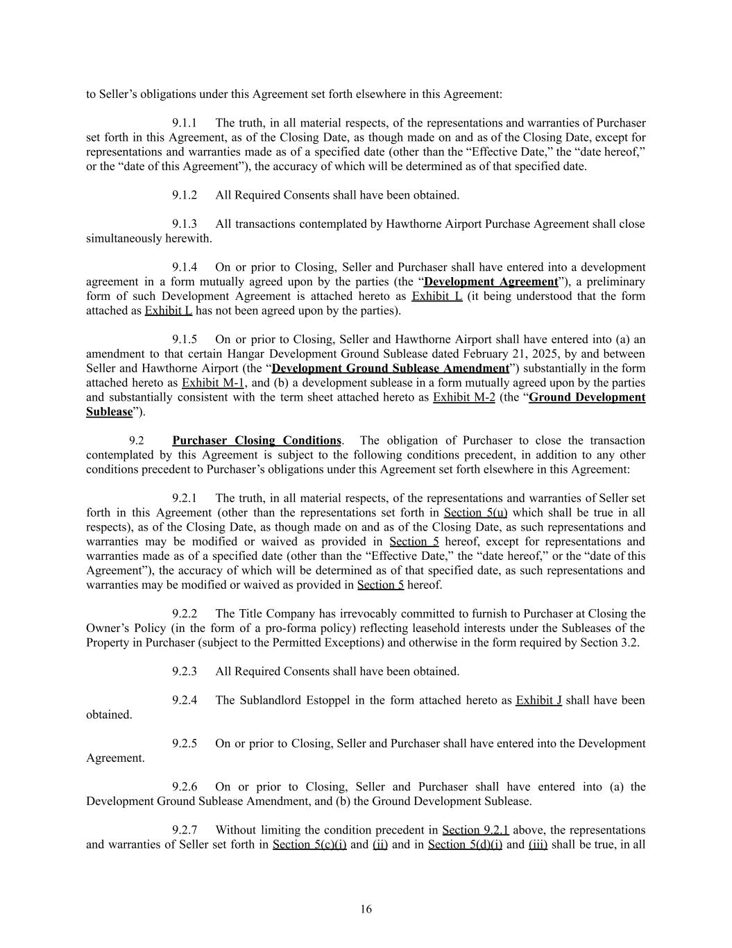 to Seller’s obligations under this Agreement set forth elsewhere in this Agreement: 9.1.1​ The truth, in all material respects, of the representations and warranties of Purchaser set forth in this Agreement, as of the Closing Date, as though made on and as of the Closing Date, except for representations and warranties made as of a specified date (other than the “Effective Date,” the “date hereof,” or the “date of this Agreement”), the accuracy of which will be determined as of that specified date. 9.1.2​ All Required Consents shall have been obtained. 9.1.3​ All transactions contemplated by Hawthorne Airport Purchase Agreement shall close simultaneously herewith. 9.1.4​ On or prior to Closing, Seller and Purchaser shall have entered into a development agreement in a form mutually agreed upon by the parties (the “Development Agreement”), a preliminary form of such Development Agreement is attached hereto as Exhibit L (it being understood that the form attached as Exhibit L has not been agreed upon by the parties). 9.1.5​ On or prior to Closing, Seller and Hawthorne Airport shall have entered into (a) an amendment to that certain Hangar Development Ground Sublease dated February 21, 2025, by and between Seller and Hawthorne Airport (the “Development Ground Sublease Amendment”) substantially in the form attached hereto as Exhibit M-1, and (b) a development sublease in a form mutually agreed upon by the parties and substantially consistent with the term sheet attached hereto as Exhibit M-2 (the “Ground Development Sublease”). 9.2​ Purchaser Closing Conditions. The obligation of Purchaser to close the transaction contemplated by this Agreement is subject to the following conditions precedent, in addition to any other conditions precedent to Purchaser’s obligations under this Agreement set forth elsewhere in this Agreement: 9.2.1​ The truth, in all material respects, of the representations and warranties of Seller set forth in this Agreement (other than the representations set forth in Section 5(u) which shall be true in all respects), as of the Closing Date, as though made on and as of the Closing Date, as such representations and warranties may be modified or waived as provided in Section 5 hereof, except for representations and warranties made as of a specified date (other than the “Effective Date,” the “date hereof,” or the “date of this Agreement”), the accuracy of which will be determined as of that specified date, as such representations and warranties may be modified or waived as provided in Section 5 hereof. 9.2.2​ The Title Company has irrevocably committed to furnish to Purchaser at Closing the Owner’s Policy (in the form of a pro-forma policy) reflecting leasehold interests under the Subleases of the Property in Purchaser (subject to the Permitted Exceptions) and otherwise in the form required by Section 3.2. 9.2.3​ All Required Consents shall have been obtained. 9.2.4​ The Sublandlord Estoppel in the form attached hereto as Exhibit J shall have been obtained. 9.2.5​ On or prior to Closing, Seller and Purchaser shall have entered into the Development Agreement. 9.2.6​ On or prior to Closing, Seller and Purchaser shall have entered into (a) the Development Ground Sublease Amendment, and (b) the Ground Development Sublease. 9.2.7​ Without limiting the condition precedent in Section 9.2.1 above, the representations and warranties of Seller set forth in Section 5(c)(i) and (ii) and in Section 5(d)(i) and (iii) shall be true, in all 16