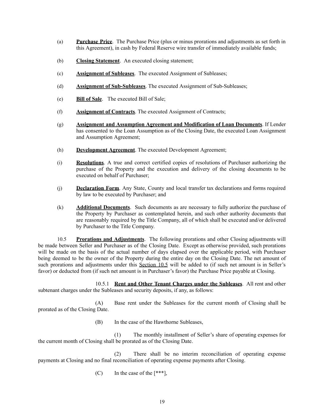 (a)​ Purchase Price. The Purchase Price (plus or minus prorations and adjustments as set forth in this Agreement), in cash by Federal Reserve wire transfer of immediately available funds; (b)​ Closing Statement. An executed closing statement; (c)​ Assignment of Subleases. The executed Assignment of Subleases; (d)​ Assignment of Sub-Subleases. The executed Assignment of Sub-Subleases; (e)​ Bill of Sale. The executed Bill of Sale; (f)​ Assignment of Contracts. The executed Assignment of Contracts; (g)​ Assignment and Assumption Agreement and Modification of Loan Documents. If Lender has consented to the Loan Assumption as of the Closing Date, the executed Loan Assignment and Assumption Agreement; (h)​ Development Agreement. The executed Development Agreement; (i)​ Resolutions. A true and correct certified copies of resolutions of Purchaser authorizing the purchase of the Property and the execution and delivery of the closing documents to be executed on behalf of Purchaser; (j)​ Declaration Form. Any State, County and local transfer tax declarations and forms required by law to be executed by Purchaser; and (k)​ Additional Documents. Such documents as are necessary to fully authorize the purchase of the Property by Purchaser as contemplated herein, and such other authority documents that are reasonably required by the Title Company, all of which shall be executed and/or delivered by Purchaser to the Title Company. 10.5​ Prorations and Adjustments. The following prorations and other Closing adjustments will be made between Seller and Purchaser as of the Closing Date. Except as otherwise provided, such prorations will be made on the basis of the actual number of days elapsed over the applicable period, with Purchaser being deemed to be the owner of the Property during the entire day on the Closing Date. The net amount of such prorations and adjustments under this Section 10.5 will be added to (if such net amount is in Seller’s favor) or deducted from (if such net amount is in Purchaser’s favor) the Purchase Price payable at Closing. 10.5.1​ Rent and Other Tenant Charges under the Subleases. All rent and other subtenant charges under the Subleases and security deposits, if any, as follows: (A)​ Base rent under the Subleases for the current month of Closing shall be prorated as of the Closing Date. (B)​ In the case of the Hawthorne Subleases, ​ (1)​ The monthly installment of Seller’s share of operating expenses for the current month of Closing shall be prorated as of the Closing Date. ​ (2)​ There shall be no interim reconciliation of operating expense payments at Closing and no final reconciliation of operating expense payments after Closing. (C)​ In the case of the [***], 19