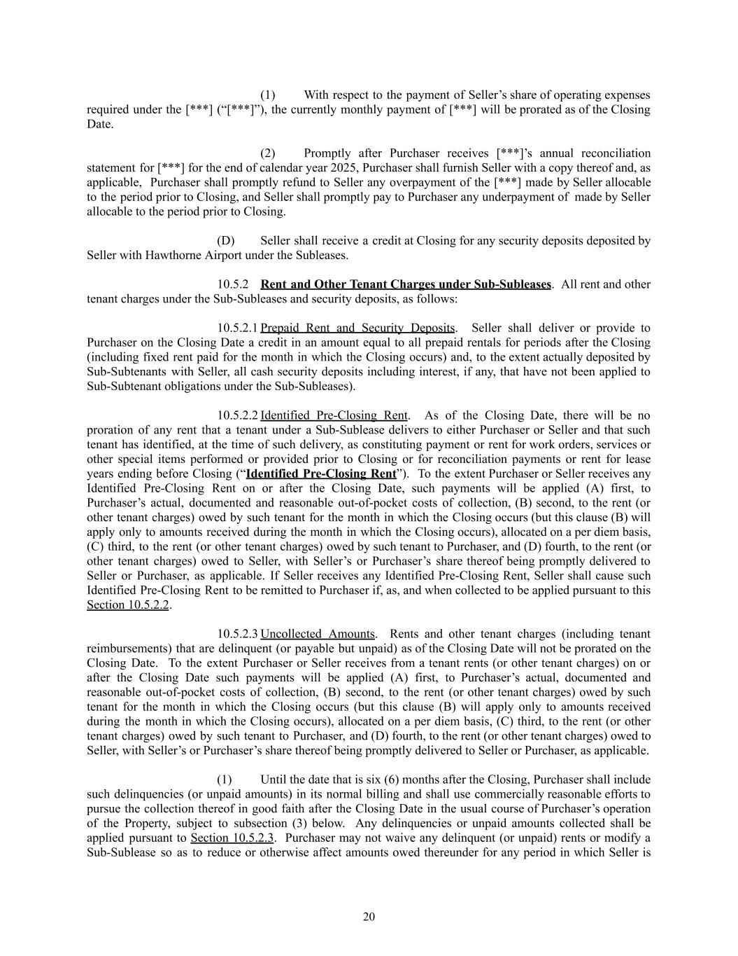 (1)​ With respect to the payment of Seller’s share of operating expenses required under the [***] (“[***]”), the currently monthly payment of [***] will be prorated as of the Closing Date. (2)​ Promptly after Purchaser receives [***]’s annual reconciliation statement for [***] for the end of calendar year 2025, Purchaser shall furnish Seller with a copy thereof and, as applicable, Purchaser shall promptly refund to Seller any overpayment of the [***] made by Seller allocable to the period prior to Closing, and Seller shall promptly pay to Purchaser any underpayment of made by Seller allocable to the period prior to Closing. (D)​ Seller shall receive a credit at Closing for any security deposits deposited by Seller with Hawthorne Airport under the Subleases. 10.5.2​ Rent and Other Tenant Charges under Sub-Subleases. All rent and other tenant charges under the Sub-Subleases and security deposits, as follows: 10.5.2.1​Prepaid Rent and Security Deposits. Seller shall deliver or provide to Purchaser on the Closing Date a credit in an amount equal to all prepaid rentals for periods after the Closing (including fixed rent paid for the month in which the Closing occurs) and, to the extent actually deposited by Sub-Subtenants with Seller, all cash security deposits including interest, if any, that have not been applied to Sub-Subtenant obligations under the Sub-Subleases). 10.5.2.2​Identified Pre-Closing Rent. As of the Closing Date, there will be no proration of any rent that a tenant under a Sub-Sublease delivers to either Purchaser or Seller and that such tenant has identified, at the time of such delivery, as constituting payment or rent for work orders, services or other special items performed or provided prior to Closing or for reconciliation payments or rent for lease years ending before Closing (“Identified Pre-Closing Rent”). To the extent Purchaser or Seller receives any Identified Pre-Closing Rent on or after the Closing Date, such payments will be applied (A) first, to Purchaser’s actual, documented and reasonable out-of-pocket costs of collection, (B) second, to the rent (or other tenant charges) owed by such tenant for the month in which the Closing occurs (but this clause (B) will apply only to amounts received during the month in which the Closing occurs), allocated on a per diem basis, (C) third, to the rent (or other tenant charges) owed by such tenant to Purchaser, and (D) fourth, to the rent (or other tenant charges) owed to Seller, with Seller’s or Purchaser’s share thereof being promptly delivered to Seller or Purchaser, as applicable. If Seller receives any Identified Pre-Closing Rent, Seller shall cause such Identified Pre-Closing Rent to be remitted to Purchaser if, as, and when collected to be applied pursuant to this Section 10.5.2.2. 10.5.2.3​Uncollected Amounts. Rents and other tenant charges (including tenant reimbursements) that are delinquent (or payable but unpaid) as of the Closing Date will not be prorated on the Closing Date. To the extent Purchaser or Seller receives from a tenant rents (or other tenant charges) on or after the Closing Date such payments will be applied (A) first, to Purchaser’s actual, documented and reasonable out-of-pocket costs of collection, (B) second, to the rent (or other tenant charges) owed by such tenant for the month in which the Closing occurs (but this clause (B) will apply only to amounts received during the month in which the Closing occurs), allocated on a per diem basis, (C) third, to the rent (or other tenant charges) owed by such tenant to Purchaser, and (D) fourth, to the rent (or other tenant charges) owed to Seller, with Seller’s or Purchaser’s share thereof being promptly delivered to Seller or Purchaser, as applicable. (1)​ Until the date that is six (6) months after the Closing, Purchaser shall include such delinquencies (or unpaid amounts) in its normal billing and shall use commercially reasonable efforts to pursue the collection thereof in good faith after the Closing Date in the usual course of Purchaser’s operation of the Property, subject to subsection (3) below. Any delinquencies or unpaid amounts collected shall be applied pursuant to Section 10.5.2.3. Purchaser may not waive any delinquent (or unpaid) rents or modify a Sub-Sublease so as to reduce or otherwise affect amounts owed thereunder for any period in which Seller is 20