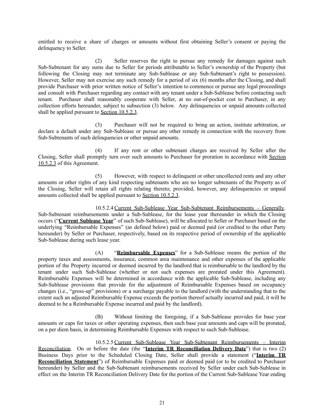 entitled to receive a share of charges or amounts without first obtaining Seller’s consent or paying the delinquency to Seller. (2)​ Seller reserves the right to pursue any remedy for damages against such Sub-Subtenant for any sums due to Seller for periods attributable to Seller’s ownership of the Property (but following the Closing may not terminate any Sub-Sublease or any Sub-Subtenant’s right to possession). However, Seller may not exercise any such remedy for a period of six (6) months after the Closing, and shall provide Purchaser with prior written notice of Seller’s intention to commence or pursue any legal proceedings and consult with Purchaser regarding any contact with any tenant under a Sub-Sublease before contacting such tenant. Purchaser shall reasonably cooperate with Seller, at no out-of-pocket cost to Purchaser, in any collection efforts hereunder, subject to subsection (3) below. Any delinquencies or unpaid amounts collected shall be applied pursuant to Section 10.5.2.3. (3)​ Purchaser will not be required to bring an action, institute arbitration, or declare a default under any Sub-Sublease or pursue any other remedy in connection with the recovery from Sub-Subtenants of such delinquencies or other unpaid amounts. (4)​ If any rent or other subtenant charges are received by Seller after the Closing, Seller shall promptly turn over such amounts to Purchaser for proration in accordance with Section 10.5.2.3 of this Agreement. (5)​ However, with respect to delinquent or other uncollected rents and any other amounts or other rights of any kind respecting subtenants who are no longer subtenants of the Property as of the Closing, Seller will retain all rights relating thereto; provided, however, any delinquencies or unpaid amounts collected shall be applied pursuant to Section 10.5.2.3. 10.5.2.4​Current Sub-Sublease Year Sub-Subtenant Reimbursements – Generally. Sub-Subtenant reimbursements under a Sub-Sublease, for the lease year thereunder in which the Closing occurs (“Current Sublease Year” of such Sub-Sublease), will be allocated to Seller or Purchaser based on the underlying “Reimbursable Expenses” (as defined below) paid or deemed paid (or credited to the other Party hereunder) by Seller or Purchaser, respectively, based on its respective period of ownership of the applicable Sub-Sublease during such lease year. (A)​ “Reimbursable Expenses” for a Sub-Sublease means the portion of the property taxes and assessments, insurance, common area maintenance and other expenses of the applicable portion of the Property incurred or deemed incurred by the landlord that is reimbursable to the landlord by the tenant under such Sub-Sublease (whether or not such expenses are prorated under this Agreement). Reimbursable Expenses will be determined in accordance with the applicable Sub-Sublease, including any Sub-Sublease provisions that provide for the adjustment of Reimbursable Expenses based on occupancy changes (i.e., “gross-up” provisions) or a surcharge payable to the landlord (with the understanding that to the extent such an adjusted Reimbursable Expense exceeds the portion thereof actually incurred and paid, it will be deemed to be a Reimbursable Expense incurred and paid by the landlord). (B)​ Without limiting the foregoing, if a Sub-Sublease provides for base year amounts or caps for taxes or other operating expenses, then such base year amounts and caps will be prorated, on a per diem basis, in determining Reimbursable Expenses with respect to such Sub-Sublease. 10.5.2.5​Current Sub-Sublease Year Sub-Subtenant Reimbursements – Interim Reconciliation. On or before the date (the “Interim TR Reconciliation Delivery Date”) that is two (2) Business Days prior to the Scheduled Closing Date, Seller shall provide a statement (“Interim TR Reconciliation Statement”) of Reimbursable Expenses paid or deemed paid (or to be credited to Purchaser hereunder) by Seller and the Sub-Subtenant reimbursements received by Seller under each Sub-Sublease in effect on the Interim TR Reconciliation Delivery Date for the portion of the Current Sub-Sublease Year ending 21