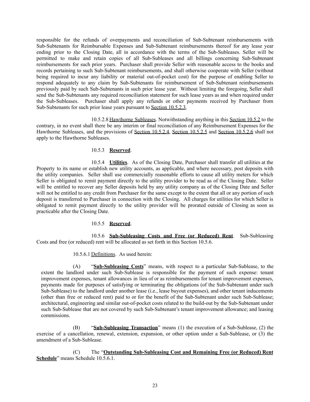 responsible for the refunds of overpayments and reconciliation of Sub-Subtenant reimbursements with Sub-Subtenants for Reimbursable Expenses and Sub-Subtenant reimbursements thereof for any lease year ending prior to the Closing Date, all in accordance with the terms of the Sub-Subleases. Seller will be permitted to make and retain copies of all Sub-Subleases and all billings concerning Sub-Subtenant reimbursements for such prior years. Purchaser shall provide Seller with reasonable access to the books and records pertaining to such Sub-Subtenant reimbursements, and shall otherwise cooperate with Seller (without being required to incur any liability or material out-of-pocket cost) for the purpose of enabling Seller to respond adequately to any claim by Sub-Subtenants for reimbursement of Sub-Subtenant reimbursements previously paid by such Sub-Subtenants in such prior lease year. Without limiting the foregoing, Seller shall send the Sub-Subtenants any required reconciliation statement for such lease years as and when required under the Sub-Subleases. Purchaser shall apply any refunds or other payments received by Purchaser from Sub-Subtenants for such prior lease years pursuant to Section 10.5.2.3. 10.5.2.8​Hawthorne Subleases. Notwithstanding anything in this Section 10.5.2 to the contrary, in no event shall there be any interim or final reconciliation of any Reimbursement Expenses for the Hawthorne Subleases, and the provisions of Section 10.5.2.4, Section 10.5.2.5 and Section 10.5.2.6 shall not apply to the Hawthorne Subleases. 10.5.3​ Reserved. 10.5.4​ Utilities. As of the Closing Date, Purchaser shall transfer all utilities at the Property to its name or establish new utility accounts, as applicable, and where necessary, post deposits with the utility companies. Seller shall use commercially reasonable efforts to cause all utility meters for which Seller is obligated to remit payment directly to the utility provider to be read as of the Closing Date. Seller will be entitled to recover any Seller deposits held by any utility company as of the Closing Date and Seller will not be entitled to any credit from Purchaser for the same except to the extent that all or any portion of such deposit is transferred to Purchaser in connection with the Closing. All charges for utilities for which Seller is obligated to remit payment directly to the utility provider will be prorated outside of Closing as soon as practicable after the Closing Date. 10.5.5​ Reserved. 10.5.6​ Sub-Subleasing Costs and Free (or Reduced) Rent. Sub-Subleasing Costs and free (or reduced) rent will be allocated as set forth in this Section 10.5.6. 10.5.6.1​Definitions. As used herein: (A)​ “Sub-Subleasing Costs” means, with respect to a particular Sub-Sublease, to the extent the landlord under such Sub-Sublease is responsible for the payment of such expense: tenant improvement expenses, tenant allowances in lieu of or as reimbursements for tenant improvement expenses, payments made for purposes of satisfying or terminating the obligations (of the Sub-Subtenant under such Sub-Sublease) to the landlord under another lease (i.e., lease buyout expenses), and other tenant inducements (other than free or reduced rent) paid to or for the benefit of the Sub-Subtenant under such Sub-Sublease; architectural, engineering and similar out-of-pocket costs related to the build-out by the Sub-Subtenant under such Sub-Sublease that are not covered by such Sub-Subtenant’s tenant improvement allowance; and leasing commissions. (B)​ “Sub-Subleasing Transaction” means (1) the execution of a Sub-Sublease, (2) the exercise of a cancellation, renewal, extension, expansion, or other option under a Sub-Sublease, or (3) the amendment of a Sub-Sublease. (C)​ The “Outstanding Sub-Subleasing Cost and Remaining Free (or Reduced) Rent Schedule” means Schedule 10.5.6.1. 23