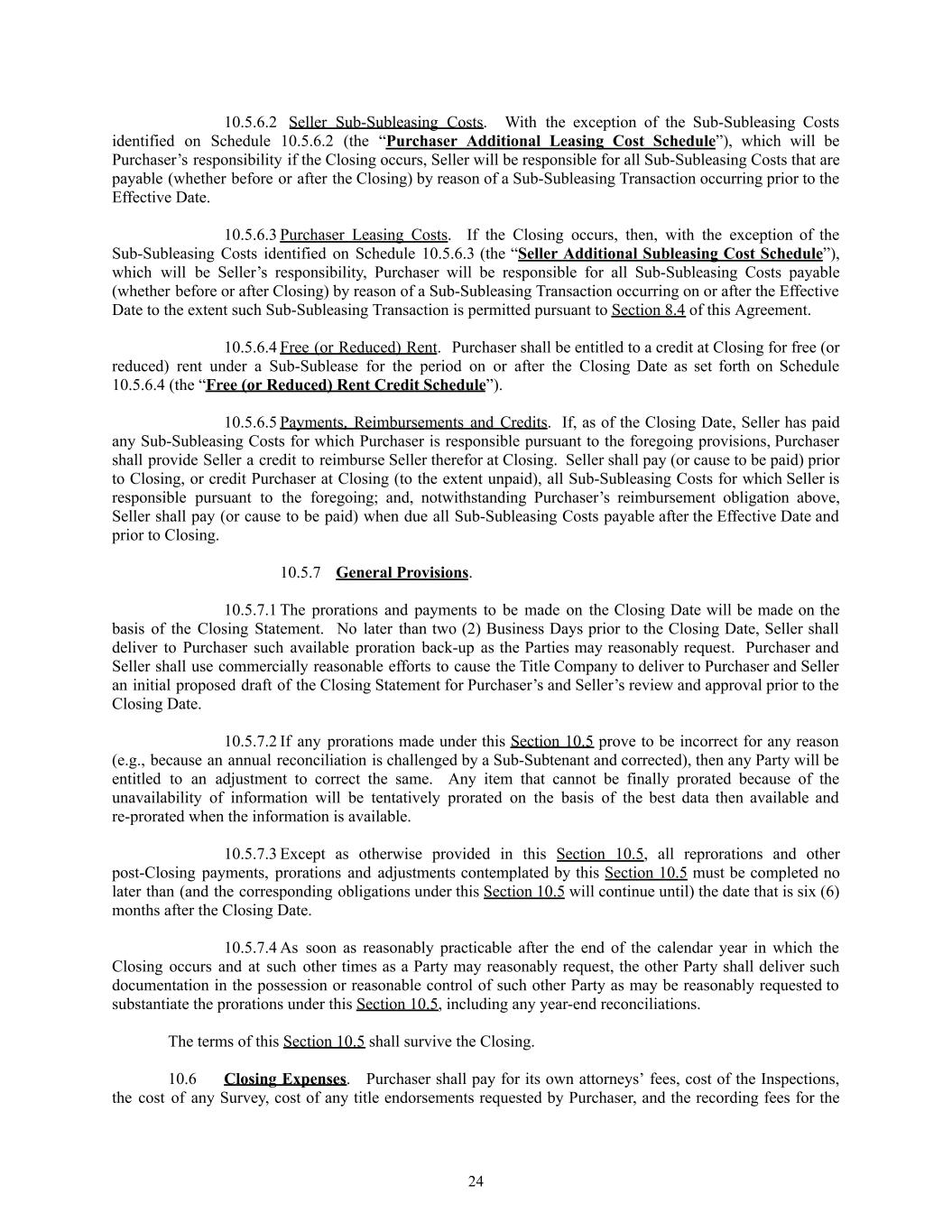 10.5.6.2​ Seller Sub-Subleasing Costs. With the exception of the Sub-Subleasing Costs identified on Schedule 10.5.6.2 (the “Purchaser Additional Leasing Cost Schedule”), which will be Purchaser’s responsibility if the Closing occurs, Seller will be responsible for all Sub-Subleasing Costs that are payable (whether before or after the Closing) by reason of a Sub-Subleasing Transaction occurring prior to the Effective Date. 10.5.6.3​Purchaser Leasing Costs. If the Closing occurs, then, with the exception of the Sub-Subleasing Costs identified on Schedule 10.5.6.3 (the “Seller Additional Subleasing Cost Schedule”), which will be Seller’s responsibility, Purchaser will be responsible for all Sub-Subleasing Costs payable (whether before or after Closing) by reason of a Sub-Subleasing Transaction occurring on or after the Effective Date to the extent such Sub-Subleasing Transaction is permitted pursuant to Section 8.4 of this Agreement. 10.5.6.4​Free (or Reduced) Rent. Purchaser shall be entitled to a credit at Closing for free (or reduced) rent under a Sub-Sublease for the period on or after the Closing Date as set forth on Schedule 10.5.6.4 (the “Free (or Reduced) Rent Credit Schedule”). 10.5.6.5​Payments, Reimbursements and Credits. If, as of the Closing Date, Seller has paid any Sub-Subleasing Costs for which Purchaser is responsible pursuant to the foregoing provisions, Purchaser shall provide Seller a credit to reimburse Seller therefor at Closing. Seller shall pay (or cause to be paid) prior to Closing, or credit Purchaser at Closing (to the extent unpaid), all Sub-Subleasing Costs for which Seller is responsible pursuant to the foregoing; and, notwithstanding Purchaser’s reimbursement obligation above, Seller shall pay (or cause to be paid) when due all Sub-Subleasing Costs payable after the Effective Date and prior to Closing. 10.5.7​ General Provisions. 10.5.7.1​The prorations and payments to be made on the Closing Date will be made on the basis of the Closing Statement. No later than two (2) Business Days prior to the Closing Date, Seller shall deliver to Purchaser such available proration back-up as the Parties may reasonably request. Purchaser and Seller shall use commercially reasonable efforts to cause the Title Company to deliver to Purchaser and Seller an initial proposed draft of the Closing Statement for Purchaser’s and Seller’s review and approval prior to the Closing Date. 10.5.7.2​If any prorations made under this Section 10.5 prove to be incorrect for any reason (e.g., because an annual reconciliation is challenged by a Sub-Subtenant and corrected), then any Party will be entitled to an adjustment to correct the same. Any item that cannot be finally prorated because of the unavailability of information will be tentatively prorated on the basis of the best data then available and re-prorated when the information is available. 10.5.7.3​Except as otherwise provided in this Section 10.5, all reprorations and other post-Closing payments, prorations and adjustments contemplated by this Section 10.5 must be completed no later than (and the corresponding obligations under this Section 10.5 will continue until) the date that is six (6) months after the Closing Date. 10.5.7.4​As soon as reasonably practicable after the end of the calendar year in which the Closing occurs and at such other times as a Party may reasonably request, the other Party shall deliver such documentation in the possession or reasonable control of such other Party as may be reasonably requested to substantiate the prorations under this Section 10.5, including any year-end reconciliations. The terms of this Section 10.5 shall survive the Closing. 10.6​ Closing Expenses. Purchaser shall pay for its own attorneys’ fees, cost of the Inspections, the cost of any Survey, cost of any title endorsements requested by Purchaser, and the recording fees for the 24