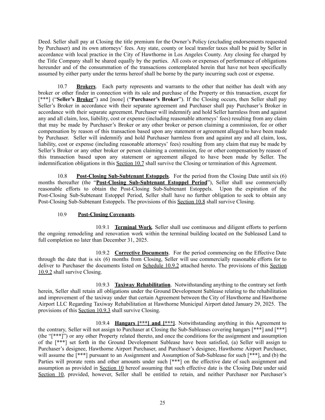 Deed. Seller shall pay at Closing the title premium for the Owner’s Policy (excluding endorsements requested by Purchaser) and its own attorneys’ fees. Any state, county or local transfer taxes shall be paid by Seller in accordance with local practice in the City of Hawthorne in Los Angeles County. Any closing fee charged by the Title Company shall be shared equally by the parties. All costs or expenses of performance of obligations hereunder and of the consummation of the transactions contemplated herein that have not been specifically assumed by either party under the terms hereof shall be borne by the party incurring such cost or expense. 10.7​ Brokers. Each party represents and warrants to the other that neither has dealt with any broker or other finder in connection with its sale and purchase of the Property or this transaction, except for [***] (“Seller’s Broker”) and [none] (“Purchaser’s Broker”). If the Closing occurs, then Seller shall pay Seller’s Broker in accordance with their separate agreement and Purchaser shall pay Purchaser’s Broker in accordance with their separate agreement. Purchaser will indemnify and hold Seller harmless from and against any and all claim, loss, liability, cost or expense (including reasonable attorneys’ fees) resulting from any claim that may be made by Purchaser’s Broker or any other broker or person claiming a commission, fee or other compensation by reason of this transaction based upon any statement or agreement alleged to have been made by Purchaser. Seller will indemnify and hold Purchaser harmless from and against any and all claim, loss, liability, cost or expense (including reasonable attorneys’ fees) resulting from any claim that may be made by Seller’s Broker or any other broker or person claiming a commission, fee or other compensation by reason of this transaction based upon any statement or agreement alleged to have been made by Seller. The indemnification obligations in this Section 10.7 shall survive the Closing or termination of this Agreement. 10.8​ Post-Closing Sub-Subtenant Estoppels. For the period from the Closing Date until six (6) months thereafter (the “Post-Closing Sub-Subtenant Estoppel Period”), Seller shall use commercially reasonable efforts to obtain the Post-Closing Sub-Subtenant Estoppels. Upon the expiration of the Post-Closing Sub-Subtenant Estoppel Period, Seller shall have no further obligation to seek to obtain any Post-Closing Sub-Subtenant Estoppels. The provisions of this Section 10.8 shall survive Closing. 10.9​ Post-Closing Covenants. 10.9.1​ Terminal Work. Seller shall use continuous and diligent efforts to perform the ongoing remodeling and renovation work within the terminal building located on the Subleased Land to full completion no later than December 31, 2025. 10.9.2​ Corrective Documents. For the period commencing on the Effective Date through the date that is six (6) months from Closing, Seller will use commercially reasonable efforts for to deliver to Purchaser the documents listed on Schedule 10.9.2 attached hereto. The provisions of this Section 10.9.2 shall survive Closing. 10.9.3​ Taxiway Rehabilitation. Notwithstanding anything to the contrary set forth herein, Seller shall retain all obligations under the Ground Development Sublease relating to the rehabilitation and improvement of the taxiway under that certain Agreement between the City of Hawthorne and Hawthorne Airport LLC Regarding Taxiway Rehabilitation at Hawthorne Municipal Airport dated January 29, 2025. The provisions of this Section 10.9.3 shall survive Closing. 10.9.4​ Hangars [***] and [***]. Notwithstanding anything in this Agreement to the contrary, Seller will not assign to Purchaser at Closing the Sub-Subleases covering hangars [***] and [***] (the “[***]”) or any other Property related thereto, and once the conditions for the assignment and assumption of the [***] set forth in the Ground Development Sublease have been satisfied, (a) Seller will assign to Purchaser’s designee, Hawthorne Airport Purchaser, and Purchaser’s designee, Hawthorne Airport Purchaser, will assume the [***] pursuant to an Assignment and Assumption of Sub-Sublease for such [***], and (b) the Parties will prorate rents and other amounts under such [***] on the effective date of such assignment and assumption as provided in Section 10 hereof assuming that such effective date is the Closing Date under said Section 10, provided, however, Seller shall be entitled to retain, and neither Purchaser nor Purchaser’s 25