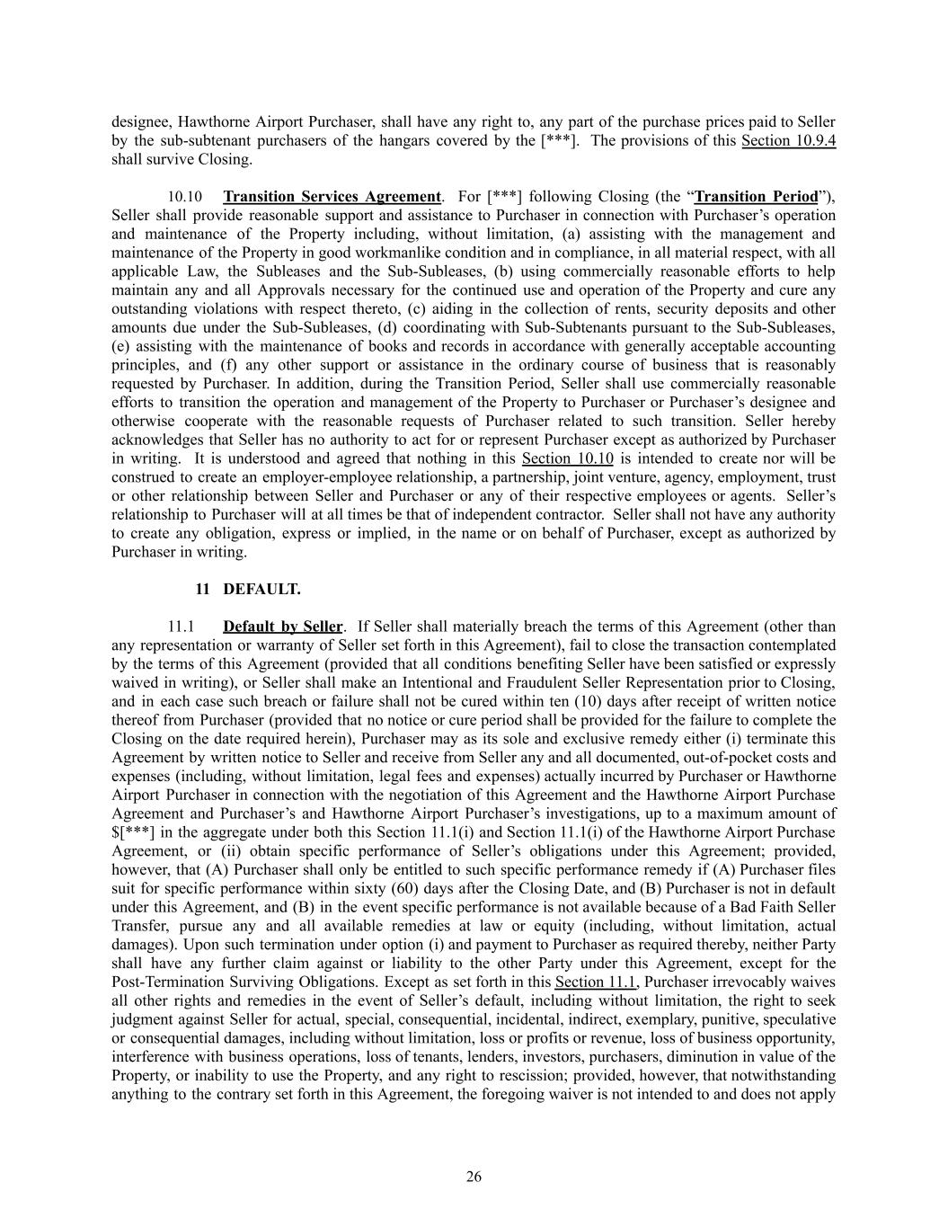 designee, Hawthorne Airport Purchaser, shall have any right to, any part of the purchase prices paid to Seller by the sub-subtenant purchasers of the hangars covered by the [***]. The provisions of this Section 10.9.4 shall survive Closing. 10.10​ Transition Services Agreement. For [***] following Closing (the “Transition Period”), Seller shall provide reasonable support and assistance to Purchaser in connection with Purchaser’s operation and maintenance of the Property including, without limitation, (a) assisting with the management and maintenance of the Property in good workmanlike condition and in compliance, in all material respect, with all applicable Law, the Subleases and the Sub-Subleases, (b) using commercially reasonable efforts to help maintain any and all Approvals necessary for the continued use and operation of the Property and cure any outstanding violations with respect thereto, (c) aiding in the collection of rents, security deposits and other amounts due under the Sub-Subleases, (d) coordinating with Sub-Subtenants pursuant to the Sub-Subleases, (e) assisting with the maintenance of books and records in accordance with generally acceptable accounting principles, and (f) any other support or assistance in the ordinary course of business that is reasonably requested by Purchaser. In addition, during the Transition Period, Seller shall use commercially reasonable efforts to transition the operation and management of the Property to Purchaser or Purchaser’s designee and otherwise cooperate with the reasonable requests of Purchaser related to such transition. Seller hereby acknowledges that Seller has no authority to act for or represent Purchaser except as authorized by Purchaser in writing. It is understood and agreed that nothing in this Section 10.10 is intended to create nor will be construed to create an employer-employee relationship, a partnership, joint venture, agency, employment, trust or other relationship between Seller and Purchaser or any of their respective employees or agents. Seller’s relationship to Purchaser will at all times be that of independent contractor. Seller shall not have any authority to create any obligation, express or implied, in the name or on behalf of Purchaser, except as authorized by Purchaser in writing. 11​ DEFAULT. 11.1​ Default by Seller. If Seller shall materially breach the terms of this Agreement (other than any representation or warranty of Seller set forth in this Agreement), fail to close the transaction contemplated by the terms of this Agreement (provided that all conditions benefiting Seller have been satisfied or expressly waived in writing), or Seller shall make an Intentional and Fraudulent Seller Representation prior to Closing, and in each case such breach or failure shall not be cured within ten (10) days after receipt of written notice thereof from Purchaser (provided that no notice or cure period shall be provided for the failure to complete the Closing on the date required herein), Purchaser may as its sole and exclusive remedy either (i) terminate this Agreement by written notice to Seller and receive from Seller any and all documented, out-of-pocket costs and expenses (including, without limitation, legal fees and expenses) actually incurred by Purchaser or Hawthorne Airport Purchaser in connection with the negotiation of this Agreement and the Hawthorne Airport Purchase Agreement and Purchaser’s and Hawthorne Airport Purchaser’s investigations, up to a maximum amount of $[***] in the aggregate under both this Section 11.1(i) and Section 11.1(i) of the Hawthorne Airport Purchase Agreement, or (ii) obtain specific performance of Seller’s obligations under this Agreement; provided, however, that (A) Purchaser shall only be entitled to such specific performance remedy if (A) Purchaser files suit for specific performance within sixty (60) days after the Closing Date, and (B) Purchaser is not in default under this Agreement, and (B) in the event specific performance is not available because of a Bad Faith Seller Transfer, pursue any and all available remedies at law or equity (including, without limitation, actual damages). Upon such termination under option (i) and payment to Purchaser as required thereby, neither Party shall have any further claim against or liability to the other Party under this Agreement, except for the Post-Termination Surviving Obligations. Except as set forth in this Section 11.1, Purchaser irrevocably waives all other rights and remedies in the event of Seller’s default, including without limitation, the right to seek judgment against Seller for actual, special, consequential, incidental, indirect, exemplary, punitive, speculative or consequential damages, including without limitation, loss or profits or revenue, loss of business opportunity, interference with business operations, loss of tenants, lenders, investors, purchasers, diminution in value of the Property, or inability to use the Property, and any right to rescission; provided, however, that notwithstanding anything to the contrary set forth in this Agreement, the foregoing waiver is not intended to and does not apply 26
