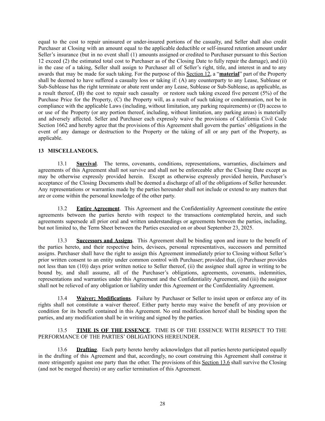 equal to the cost to repair uninsured or under-insured portions of the casualty, and Seller shall also credit Purchaser at Closing with an amount equal to the applicable deductible or self-insured retention amount under Seller’s insurance (but in no event shall (1) amounts assigned or credited to Purchaser pursuant to this Section 12 exceed (2) the estimated total cost to Purchaser as of the Closing Date to fully repair the damage), and (ii) in the case of a taking, Seller shall assign to Purchaser all of Seller’s right, title, and interest in and to any awards that may be made for such taking. For the purpose of this Section 12, a “material” part of the Property shall be deemed to have suffered a casualty loss or taking if: (A) any counterparty to any Lease, Sublease or Sub-Sublease has the right terminate or abate rent under any Lease, Sublease or Sub-Sublease, as applicable, as a result thereof, (B) the cost to repair such casualty or restore such taking exceed five percent (5%) of the Purchase Price for the Property, (C) the Property will, as a result of such taking or condemnation, not be in compliance with the applicable Laws (including, without limitation, any parking requirements) or (D) access to or use of the Property (or any portion thereof, including, without limitation, any parking areas) is materially and adversely affected. Seller and Purchaser each expressly waive the provisions of California Civil Code Section 1662 and hereby agree that the provisions of this Agreement shall govern the parties’ obligations in the event of any damage or destruction to the Property or the taking of all or any part of the Property, as applicable. 13​ MISCELLANEOUS. 13.1​ Survival. The terms, covenants, conditions, representations, warranties, disclaimers and agreements of this Agreement shall not survive and shall not be enforceable after the Closing Date except as may be otherwise expressly provided herein. Except as otherwise expressly provided herein, Purchaser’s acceptance of the Closing Documents shall be deemed a discharge of all of the obligations of Seller hereunder. Any representations or warranties made by the parties hereunder shall not include or extend to any matters that are or come within the personal knowledge of the other party. 13.2​ Entire Agreement. This Agreement and the Confidentiality Agreement constitute the entire agreements between the parties hereto with respect to the transactions contemplated herein, and such agreements supersede all prior oral and written understandings or agreements between the parties, including, but not limited to, the Term Sheet between the Parties executed on or about September 23, 2025. 13.3​ Successors and Assigns. This Agreement shall be binding upon and inure to the benefit of the parties hereto, and their respective heirs, devisees, personal representatives, successors and permitted assigns. Purchaser shall have the right to assign this Agreement immediately prior to Closing without Seller’s prior written consent to an entity under common control with Purchaser; provided that, (i) Purchaser provides not less than ten (10)) days prior written notice to Seller thereof, (ii) the assignee shall agree in writing to be bound by, and shall assume, all of the Purchaser’s obligations, agreements, covenants, indemnities, representations and warranties under this Agreement and the Confidentiality Agreement, and (iii) the assignor shall not be relieved of any obligation or liability under this Agreement or the Confidentiality Agreement. 13.4​ Waiver; Modifications. Failure by Purchaser or Seller to insist upon or enforce any of its rights shall not constitute a waiver thereof. Either party hereto may waive the benefit of any provision or condition for its benefit contained in this Agreement. No oral modification hereof shall be binding upon the parties, and any modification shall be in writing and signed by the parties. 13.5​ TIME IS OF THE ESSENCE. TIME IS OF THE ESSENCE WITH RESPECT TO THE PERFORMANCE OF THE PARTIES’ OBLIGATIONS HEREUNDER. 13.6​ Drafting. Each party hereto hereby acknowledges that all parties hereto participated equally in the drafting of this Agreement and that, accordingly, no court construing this Agreement shall construe it more stringently against one party than the other. The provisions of this Section 13.6 shall survive the Closing (and not be merged therein) or any earlier termination of this Agreement. 28