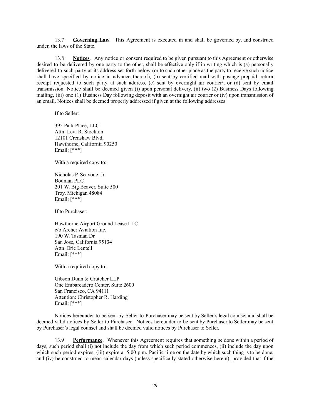 13.7​ Governing Law. This Agreement is executed in and shall be governed by, and construed under, the laws of the State. 13.8​ Notices. Any notice or consent required to be given pursuant to this Agreement or otherwise desired to be delivered by one party to the other, shall be effective only if in writing which is (a) personally delivered to such party at its address set forth below (or to such other place as the party to receive such notice shall have specified by notice in advance thereof), (b) sent by certified mail with postage prepaid, return receipt requested to such party at such address, (c) sent by overnight air courier\, or (d) sent by email transmission. Notice shall be deemed given (i) upon personal delivery, (ii) two (2) Business Days following mailing, (iii) one (1) Business Day following deposit with an overnight air courier or (iv) upon transmission of an email. Notices shall be deemed properly addressed if given at the following addresses: If to Seller: ​ 395 Park Place, LLC ​ Attn: Levi R. Stockton ​ 12101 Crenshaw Blvd, ​ Hawthorne, California 90250 ​ Email: [***] ​ ​ With a required copy to: ​ Nicholas P. Scavone, Jr. ​ Bodman PLC ​ 201 W. Big Beaver, Suite 500 ​ Troy, Michigan 48084 ​ Email: [***] If to Purchaser: Hawthorne Airport Ground Lease LLC c/o Archer Aviation Inc. 190 W. Tasman Dr. San Jose, California 95134 Attn: Eric Lentell Email: [***] With a required copy to: Gibson Dunn & Crutcher LLP One Embarcadero Center, Suite 2600 San Francisco, CA 94111 Attention: Christopher R. Harding Email: [***] Notices hereunder to be sent by Seller to Purchaser may be sent by Seller’s legal counsel and shall be deemed valid notices by Seller to Purchaser. Notices hereunder to be sent by Purchaser to Seller may be sent by Purchaser’s legal counsel and shall be deemed valid notices by Purchaser to Seller. 13.9​ Performance. Whenever this Agreement requires that something be done within a period of days, such period shall (i) not include the day from which such period commences, (ii) include the day upon which such period expires, (iii) expire at 5:00 p.m. Pacific time on the date by which such thing is to be done, and (iv) be construed to mean calendar days (unless specifically stated otherwise herein); provided that if the 29