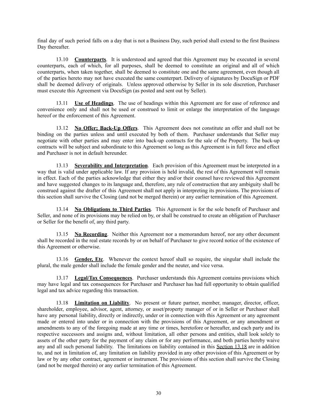 final day of such period falls on a day that is not a Business Day, such period shall extend to the first Business Day thereafter. 13.10​ Counterparts. It is understood and agreed that this Agreement may be executed in several counterparts, each of which, for all purposes, shall be deemed to constitute an original and all of which counterparts, when taken together, shall be deemed to constitute one and the same agreement, even though all of the parties hereto may not have executed the same counterpart. Delivery of signatures by DocuSign or PDF shall be deemed delivery of originals. Unless approved otherwise by Seller in its sole discretion, Purchaser must execute this Agreement via DocuSign (as posted and sent out by Seller). 13.11​ Use of Headings. The use of headings within this Agreement are for ease of reference and convenience only and shall not be used or construed to limit or enlarge the interpretation of the language hereof or the enforcement of this Agreement. 13.12​ No Offer; Back-Up Offers. This Agreement does not constitute an offer and shall not be binding on the parties unless and until executed by both of them. Purchaser understands that Seller may negotiate with other parties and may enter into back-up contracts for the sale of the Property. The back-up contracts will be subject and subordinate to this Agreement so long as this Agreement is in full force and effect and Purchaser is not in default hereunder. 13.13​ Severability and Interpretation. Each provision of this Agreement must be interpreted in a way that is valid under applicable law. If any provision is held invalid, the rest of this Agreement will remain in effect. Each of the parties acknowledge that either they and/or their counsel have reviewed this Agreement and have suggested changes to its language and, therefore, any rule of construction that any ambiguity shall be construed against the drafter of this Agreement shall not apply in interpreting its provisions. The provisions of this section shall survive the Closing (and not be merged therein) or any earlier termination of this Agreement. 13.14​ No Obligations to Third Parties. This Agreement is for the sole benefit of Purchaser and Seller, and none of its provisions may be relied on by, or shall be construed to create an obligation of Purchaser or Seller for the benefit of, any third party. 13.15​ No Recording. Neither this Agreement nor a memorandum hereof, nor any other document shall be recorded in the real estate records by or on behalf of Purchaser to give record notice of the existence of this Agreement or otherwise. 13.16​ Gender, Etc. Whenever the context hereof shall so require, the singular shall include the plural, the male gender shall include the female gender and the neuter, and vice versa. 13.17​ Legal/Tax Consequences. Purchaser understands this Agreement contains provisions which may have legal and tax consequences for Purchaser and Purchaser has had full opportunity to obtain qualified legal and tax advice regarding this transaction. 13.18​ Limitation on Liability. No present or future partner, member, manager, director, officer, shareholder, employee, advisor, agent, attorney, or asset/property manager of or in Seller or Purchaser shall have any personal liability, directly or indirectly, under or in connection with this Agreement or any agreement made or entered into under or in connection with the provisions of this Agreement, or any amendment or amendments to any of the foregoing made at any time or times, heretofore or hereafter, and each party and its respective successors and assigns and, without limitation, all other persons and entities, shall look solely to assets of the other party for the payment of any claim or for any performance, and both parties hereby waive any and all such personal liability. The limitations on liability contained in this Section 13.18 are in addition to, and not in limitation of, any limitation on liability provided in any other provision of this Agreement or by law or by any other contract, agreement or instrument. The provisions of this section shall survive the Closing (and not be merged therein) or any earlier termination of this Agreement. 30