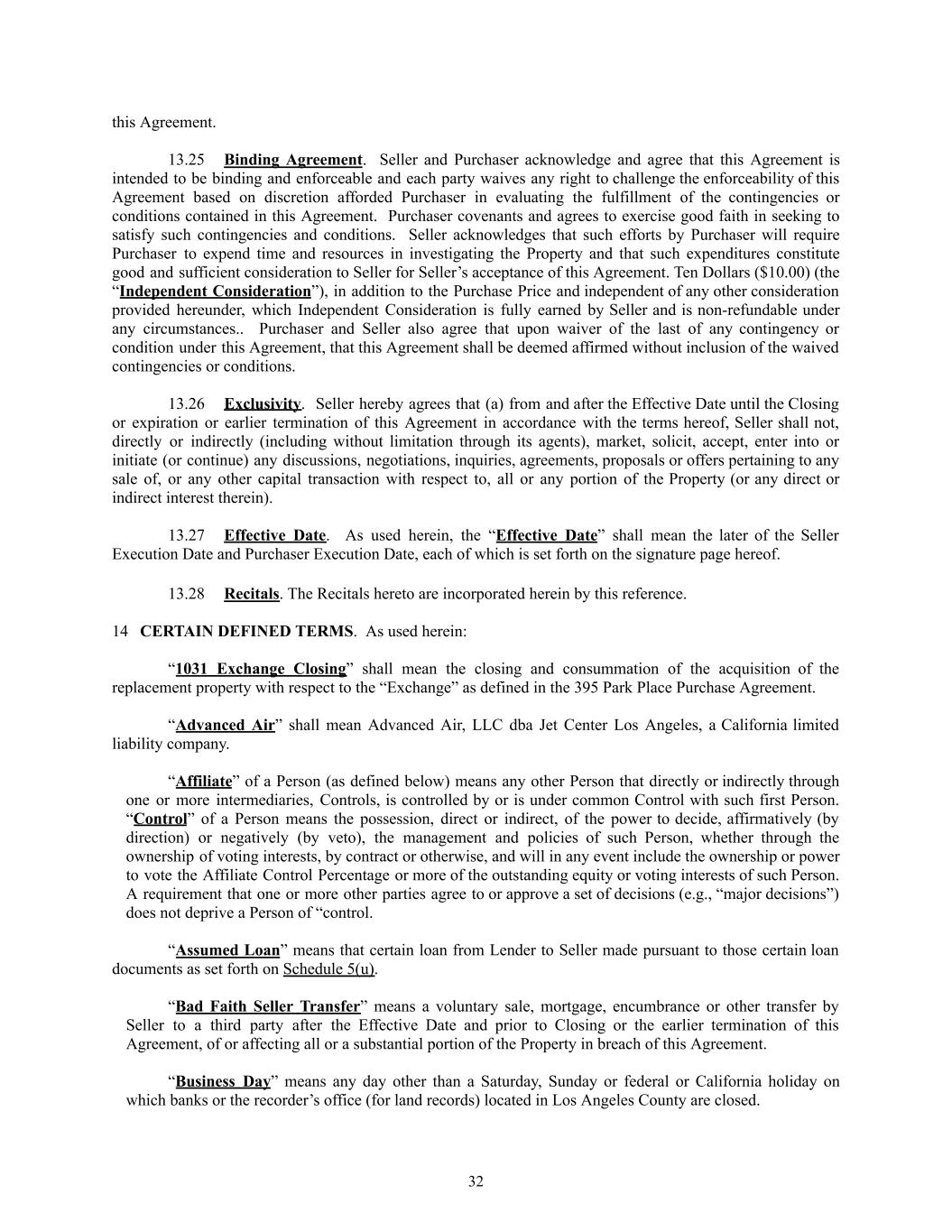 this Agreement. 13.25​ Binding Agreement. Seller and Purchaser acknowledge and agree that this Agreement is intended to be binding and enforceable and each party waives any right to challenge the enforceability of this Agreement based on discretion afforded Purchaser in evaluating the fulfillment of the contingencies or conditions contained in this Agreement. Purchaser covenants and agrees to exercise good faith in seeking to satisfy such contingencies and conditions. Seller acknowledges that such efforts by Purchaser will require Purchaser to expend time and resources in investigating the Property and that such expenditures constitute good and sufficient consideration to Seller for Seller’s acceptance of this Agreement. Ten Dollars ($10.00) (the “Independent Consideration”), in addition to the Purchase Price and independent of any other consideration provided hereunder, which Independent Consideration is fully earned by Seller and is non-refundable under any circumstances.. Purchaser and Seller also agree that upon waiver of the last of any contingency or condition under this Agreement, that this Agreement shall be deemed affirmed without inclusion of the waived contingencies or conditions. 13.26​ Exclusivity. Seller hereby agrees that (a) from and after the Effective Date until the Closing or expiration or earlier termination of this Agreement in accordance with the terms hereof, Seller shall not, directly or indirectly (including without limitation through its agents), market, solicit, accept, enter into or initiate (or continue) any discussions, negotiations, inquiries, agreements, proposals or offers pertaining to any sale of, or any other capital transaction with respect to, all or any portion of the Property (or any direct or indirect interest therein). 13.27​ Effective Date. As used herein, the “Effective Date” shall mean the later of the Seller Execution Date and Purchaser Execution Date, each of which is set forth on the signature page hereof. 13.28​ Recitals. The Recitals hereto are incorporated herein by this reference. 14​ CERTAIN DEFINED TERMS. As used herein: “1031 Exchange Closing” shall mean the closing and consummation of the acquisition of the replacement property with respect to the “Exchange” as defined in the 395 Park Place Purchase Agreement. “Advanced Air” shall mean Advanced Air, LLC dba Jet Center Los Angeles, a California limited liability company. “Affiliate” of a Person (as defined below) means any other Person that directly or indirectly through one or more intermediaries, Controls, is controlled by or is under common Control with such first Person. “Control” of a Person means the possession, direct or indirect, of the power to decide, affirmatively (by direction) or negatively (by veto), the management and policies of such Person, whether through the ownership of voting interests, by contract or otherwise, and will in any event include the ownership or power to vote the Affiliate Control Percentage or more of the outstanding equity or voting interests of such Person. A requirement that one or more other parties agree to or approve a set of decisions (e.g., “major decisions”) does not deprive a Person of “control. “Assumed Loan” means that certain loan from Lender to Seller made pursuant to those certain loan documents as set forth on Schedule 5(u). “Bad Faith Seller Transfer” means a voluntary sale, mortgage, encumbrance or other transfer by Seller to a third party after the Effective Date and prior to Closing or the earlier termination of this Agreement, of or affecting all or a substantial portion of the Property in breach of this Agreement. “Business Day” means any day other than a Saturday, Sunday or federal or California holiday on which banks or the recorder’s office (for land records) located in Los Angeles County are closed. 32