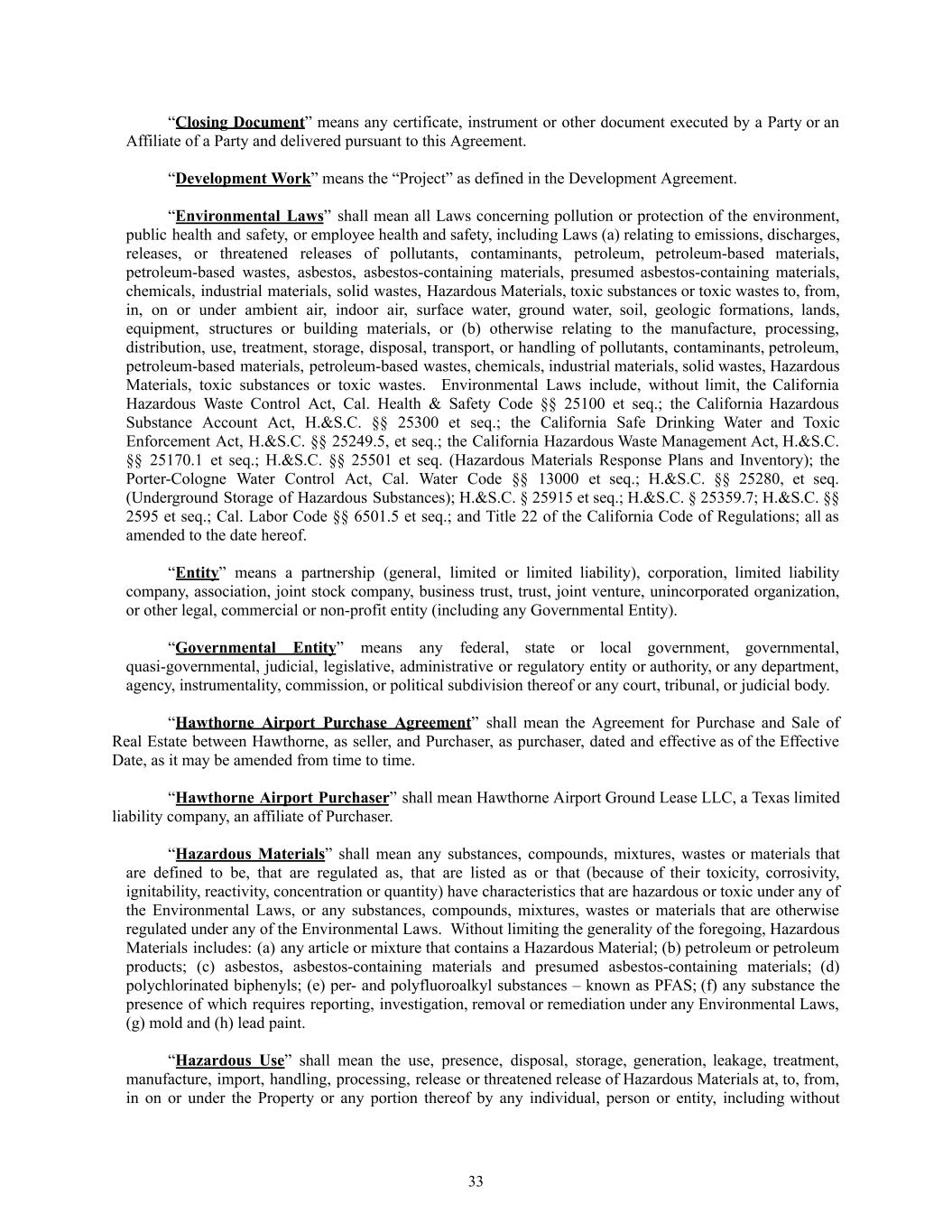 “Closing Document” means any certificate, instrument or other document executed by a Party or an Affiliate of a Party and delivered pursuant to this Agreement. “Development Work” means the “Project” as defined in the Development Agreement. “Environmental Laws” shall mean all Laws concerning pollution or protection of the environment, public health and safety, or employee health and safety, including Laws (a) relating to emissions, discharges, releases, or threatened releases of pollutants, contaminants, petroleum, petroleum-based materials, petroleum-based wastes, asbestos, asbestos-containing materials, presumed asbestos-containing materials, chemicals, industrial materials, solid wastes, Hazardous Materials, toxic substances or toxic wastes to, from, in, on or under ambient air, indoor air, surface water, ground water, soil, geologic formations, lands, equipment, structures or building materials, or (b) otherwise relating to the manufacture, processing, distribution, use, treatment, storage, disposal, transport, or handling of pollutants, contaminants, petroleum, petroleum-based materials, petroleum-based wastes, chemicals, industrial materials, solid wastes, Hazardous Materials, toxic substances or toxic wastes. Environmental Laws include, without limit, the California Hazardous Waste Control Act, Cal. Health & Safety Code §§ 25100 et seq.; the California Hazardous Substance Account Act, H.&S.C. §§ 25300 et seq.; the California Safe Drinking Water and Toxic Enforcement Act, H.&S.C. §§ 25249.5, et seq.; the California Hazardous Waste Management Act, H.&S.C. §§ 25170.1 et seq.; H.&S.C. §§ 25501 et seq. (Hazardous Materials Response Plans and Inventory); the Porter-Cologne Water Control Act, Cal. Water Code §§ 13000 et seq.; H.&S.C. §§ 25280, et seq. (Underground Storage of Hazardous Substances); H.&S.C. § 25915 et seq.; H.&S.C. § 25359.7; H.&S.C. §§ 2595 et seq.; Cal. Labor Code §§ 6501.5 et seq.; and Title 22 of the California Code of Regulations; all as amended to the date hereof. “Entity” means a partnership (general, limited or limited liability), corporation, limited liability company, association, joint stock company, business trust, trust, joint venture, unincorporated organization, or other legal, commercial or non-profit entity (including any Governmental Entity). “Governmental Entity” means any federal, state or local government, governmental, quasi-governmental, judicial, legislative, administrative or regulatory entity or authority, or any department, agency, instrumentality, commission, or political subdivision thereof or any court, tribunal, or judicial body. “Hawthorne Airport Purchase Agreement” shall mean the Agreement for Purchase and Sale of Real Estate between Hawthorne, as seller, and Purchaser, as purchaser, dated and effective as of the Effective Date, as it may be amended from time to time. “Hawthorne Airport Purchaser” shall mean Hawthorne Airport Ground Lease LLC, a Texas limited liability company, an affiliate of Purchaser. “Hazardous Materials” shall mean any substances, compounds, mixtures, wastes or materials that are defined to be, that are regulated as, that are listed as or that (because of their toxicity, corrosivity, ignitability, reactivity, concentration or quantity) have characteristics that are hazardous or toxic under any of the Environmental Laws, or any substances, compounds, mixtures, wastes or materials that are otherwise regulated under any of the Environmental Laws. Without limiting the generality of the foregoing, Hazardous Materials includes: (a) any article or mixture that contains a Hazardous Material; (b) petroleum or petroleum products; (c) asbestos, asbestos-containing materials and presumed asbestos-containing materials; (d) polychlorinated biphenyls; (e) per- and polyfluoroalkyl substances – known as PFAS; (f) any substance the presence of which requires reporting, investigation, removal or remediation under any Environmental Laws, (g) mold and (h) lead paint. “Hazardous Use” shall mean the use, presence, disposal, storage, generation, leakage, treatment, manufacture, import, handling, processing, release or threatened release of Hazardous Materials at, to, from, in on or under the Property or any portion thereof by any individual, person or entity, including without 33