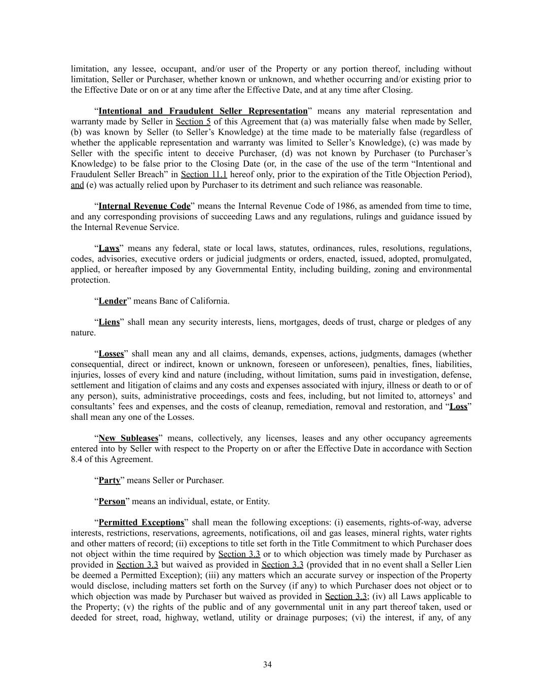 limitation, any lessee, occupant, and/or user of the Property or any portion thereof, including without limitation, Seller or Purchaser, whether known or unknown, and whether occurring and/or existing prior to the Effective Date or on or at any time after the Effective Date, and at any time after Closing. “Intentional and Fraudulent Seller Representation” means any material representation and warranty made by Seller in Section 5 of this Agreement that (a) was materially false when made by Seller, (b) was known by Seller (to Seller’s Knowledge) at the time made to be materially false (regardless of whether the applicable representation and warranty was limited to Seller’s Knowledge), (c) was made by Seller with the specific intent to deceive Purchaser, (d) was not known by Purchaser (to Purchaser’s Knowledge) to be false prior to the Closing Date (or, in the case of the use of the term “Intentional and Fraudulent Seller Breach” in Section 11.1 hereof only, prior to the expiration of the Title Objection Period), and (e) was actually relied upon by Purchaser to its detriment and such reliance was reasonable. “Internal Revenue Code” means the Internal Revenue Code of 1986, as amended from time to time, and any corresponding provisions of succeeding Laws and any regulations, rulings and guidance issued by the Internal Revenue Service. “Laws” means any federal, state or local laws, statutes, ordinances, rules, resolutions, regulations, codes, advisories, executive orders or judicial judgments or orders, enacted, issued, adopted, promulgated, applied, or hereafter imposed by any Governmental Entity, including building, zoning and environmental protection. “Lender” means Banc of California. “Liens” shall mean any security interests, liens, mortgages, deeds of trust, charge or pledges of any nature. “Losses” shall mean any and all claims, demands, expenses, actions, judgments, damages (whether consequential, direct or indirect, known or unknown, foreseen or unforeseen), penalties, fines, liabilities, injuries, losses of every kind and nature (including, without limitation, sums paid in investigation, defense, settlement and litigation of claims and any costs and expenses associated with injury, illness or death to or of any person), suits, administrative proceedings, costs and fees, including, but not limited to, attorneys’ and consultants’ fees and expenses, and the costs of cleanup, remediation, removal and restoration, and “Loss” shall mean any one of the Losses. “New Subleases” means, collectively, any licenses, leases and any other occupancy agreements entered into by Seller with respect to the Property on or after the Effective Date in accordance with Section 8.4 of this Agreement. “Party” means Seller or Purchaser. “Person” means an individual, estate, or Entity. “Permitted Exceptions” shall mean the following exceptions: (i) easements, rights-of-way, adverse interests, restrictions, reservations, agreements, notifications, oil and gas leases, mineral rights, water rights and other matters of record; (ii) exceptions to title set forth in the Title Commitment to which Purchaser does not object within the time required by Section 3.3 or to which objection was timely made by Purchaser as provided in Section 3.3 but waived as provided in Section 3.3 (provided that in no event shall a Seller Lien be deemed a Permitted Exception); (iii) any matters which an accurate survey or inspection of the Property would disclose, including matters set forth on the Survey (if any) to which Purchaser does not object or to which objection was made by Purchaser but waived as provided in Section 3.3; (iv) all Laws applicable to the Property; (v) the rights of the public and of any governmental unit in any part thereof taken, used or deeded for street, road, highway, wetland, utility or drainage purposes; (vi) the interest, if any, of any 34