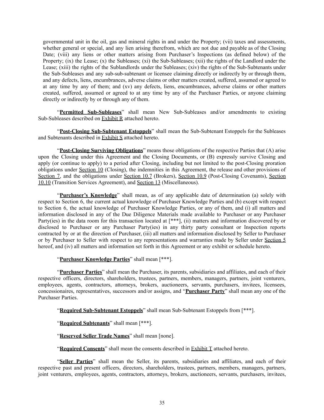 governmental unit in the oil, gas and mineral rights in and under the Property; (vii) taxes and assessments, whether general or special, and any lien arising therefrom, which are not due and payable as of the Closing Date; (viii) any liens or other matters arising from Purchaser’s Inspections (as defined below) of the Property; (ix) the Lease; (x) the Subleases; (xi) the Sub-Subleases; (xii) the rights of the Landlord under the Lease; (xiii) the rights of the Sublandlords under the Subleases; (xiv) the rights of the Sub-Subtenants under the Sub-Subleases and any sub-sub-subtenant or licensee claiming directly or indirectly by or through them, and any defects, liens, encumbrances, adverse claims or other matters created, suffered, assumed or agreed to at any time by any of them; and (xv) any defects, liens, encumbrances, adverse claims or other matters created, suffered, assumed or agreed to at any time by any of the Purchaser Parties, or anyone claiming directly or indirectly by or through any of them. “Permitted Sub-Subleases” shall mean New Sub-Subleases and/or amendments to existing Sub-Subleases described on Exhibit R attached hereto. “Post-Closing Sub-Subtenant Estoppels” shall mean the Sub-Subtenant Estoppels for the Subleases and Subtenants described in Exhibit S attached hereto. “Post-Closing Surviving Obligations” means those obligations of the respective Parties that (A) arise upon the Closing under this Agreement and the Closing Documents, or (B) expressly survive Closing and apply (or continue to apply) to a period after Closing, including but not limited to the post-Closing proration obligations under Section 10 (Closing), the indemnities in this Agreement, the release and other provisions of Section 7, and the obligations under Section 10.7 (Brokers), Section 10.9 (Post-Closing Covenants), Section 10.10 (Transition Services Agreement), and Section 13 (Miscellaneous). “Purchaser’s Knowledge” shall mean, as of any applicable date of determination (a) solely with respect to Section 6, the current actual knowledge of Purchaser Knowledge Parties and (b) except with respect to Section 6, the actual knowledge of Purchaser Knowledge Parties, or any of them, and (i) all matters and information disclosed in any of the Due Diligence Materials made available to Purchaser or any Purchaser Party(ies) in the data room for this transaction located at [***], (ii) matters and information discovered by or disclosed to Purchaser or any Purchaser Party(ies) in any thirty party consultant or Inspection reports contracted by or at the direction of Purchaser, (iii) all matters and information disclosed by Seller to Purchaser or by Purchaser to Seller with respect to any representations and warranties made by Seller under Section 5 hereof, and (iv) all matters and information set forth in this Agreement or any exhibit or schedule hereto. “Purchaser Knowledge Parties” shall mean [***]. “Purchaser Parties” shall mean the Purchaser, its parents, subsidiaries and affiliates, and each of their respective officers, directors, shareholders, trustees, partners, members, managers, partners, joint venturers, employees, agents, contractors, attorneys, brokers, auctioneers, servants, purchasers, invitees, licensees, concessionaires, representatives, successors and/or assigns, and “Purchaser Party” shall mean any one of the Purchaser Parties. “Required Sub-Subtenant Estoppels” shall mean Sub-Subtenant Estoppels from [***]. “Required Subtenants” shall mean [***]. “Reserved Seller Trade Names” shall mean [none]. “Required Consents” shall mean the consents described in Exhibit T attached hereto. “Seller Parties” shall mean the Seller, its parents, subsidiaries and affiliates, and each of their respective past and present officers, directors, shareholders, trustees, partners, members, managers, partners, joint venturers, employees, agents, contractors, attorneys, brokers, auctioneers, servants, purchasers, invitees, 35