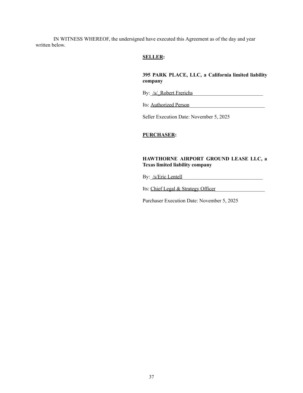 ​ IN WITNESS WHEREOF, the undersigned have executed this Agreement as of the day and year written below. SELLER: 395 PARK PLACE, LLC, a California limited liability company By:_/s/_Robert Frerichs___________________________ Its: Authorized Person_____________________________ Seller Execution Date: November 5, 2025 PURCHASER: HAWTHORNE AIRPORT GROUND LEASE LLC, a Texas limited liability company By:_/s/Eric Lentell_______________________________ ​ Its: Chief Legal & Strategy Officer___________________ Purchaser Execution Date: November 5, 2025 37