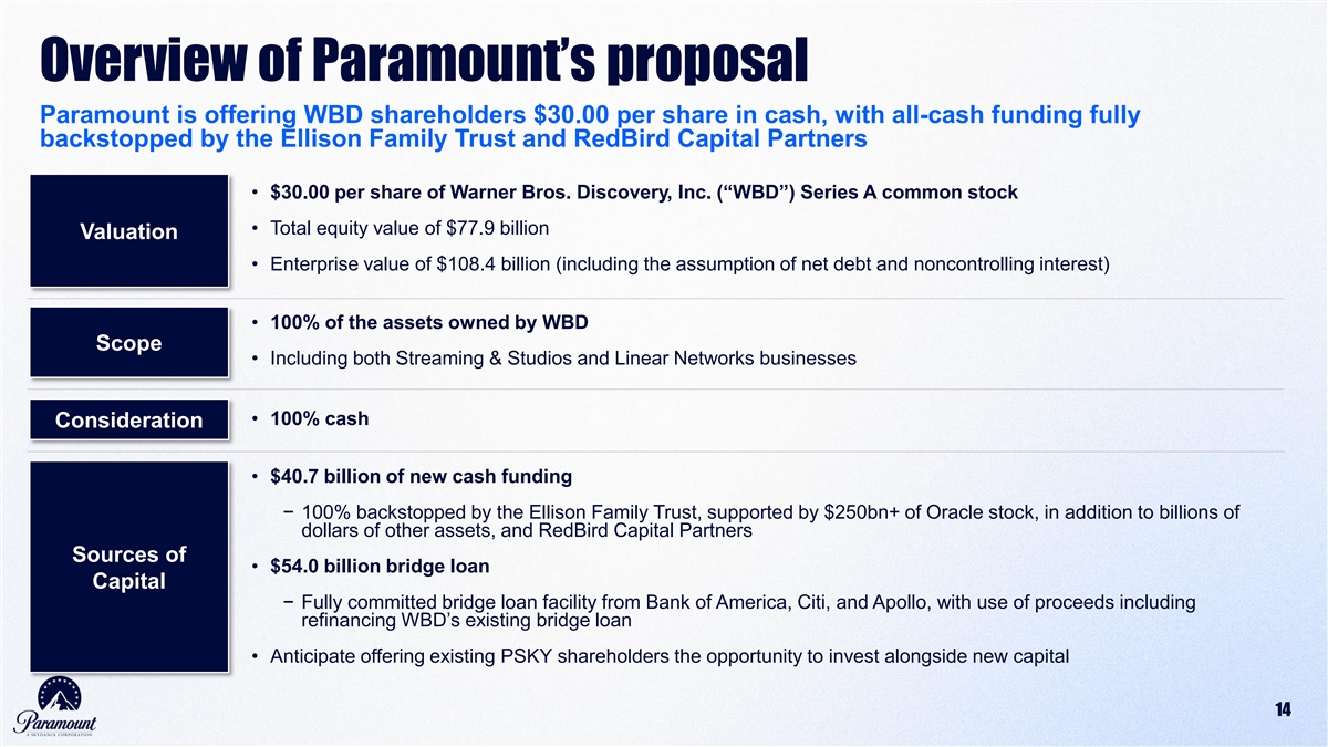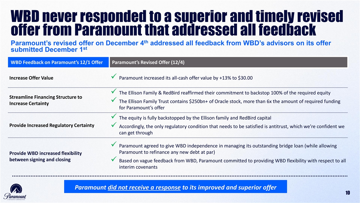 WBD never responded to a superior and timely revised offer from Paramount that addressed all feedback th Paramount’s revised offer on December 4 addressed all feedback from WBD’s advisors on its offer st submitted December 1 WBD Feedback on Paramount’s 12/1 Offer Paramount’s Revised Offer (12/4) Increase Offer Value✓ Paramount increased its all-cash offer value by +13% to $30.00 ✓ The Ellison Family & RedBird reaffirmed their commitment to backstop 100% of the required equity Streamline Financing Structure to ✓ The Ellison Family Trust contains $250bn+ of Oracle stock, more than 6x the amount of required funding Increase Certainty for Paramount’s offer ✓ The equity is fully backstopped by the Ellison family and RedBird capital Provide Increased Regulatory Certainty ✓ Accordingly, the only regulatory condition that needs to be satisfied is antitrust, which we’re confident we can get through ✓ Paramount agreed to give WBD independence in managing its outstanding bridge loan (while allowing Paramount to refinance any new debt at par) Provide WBD increased flexibility between signing and closing ✓ Based on vague feedback from WBD, Paramount committed to providing WBD flexibility with respect to all interim covenants Paramount did not receive a response to its improved and superior offer 10
