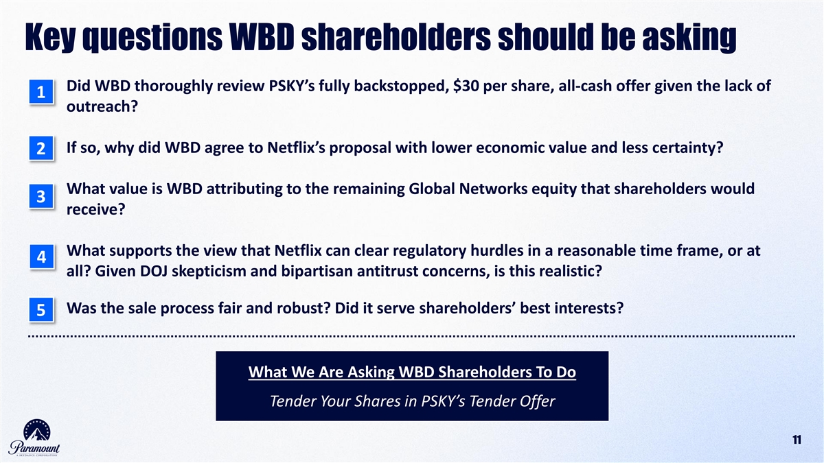 Key questions WBD shareholders should be asking Did WBD thoroughly review PSKY’s fully backstopped, $30 per share, all-cash offer given the lack of 1 outreach? If so, why did WBD agree to Netflix’s proposal with lower economic value and less certainty? 2 What value is WBD attributing to the remaining Global Networks equity that shareholders would 3 receive? What supports the view that Netflix can clear regulatory hurdles in a reasonable time frame, or at 4 all? Given DOJ skepticism and bipartisan antitrust concerns, is this realistic? Was the sale process fair and robust? Did it serve shareholders’ best interests? 5 What We Are Asking WBD Shareholders To Do Tender Your Shares in PSKY’s Tender Offer 11 11
