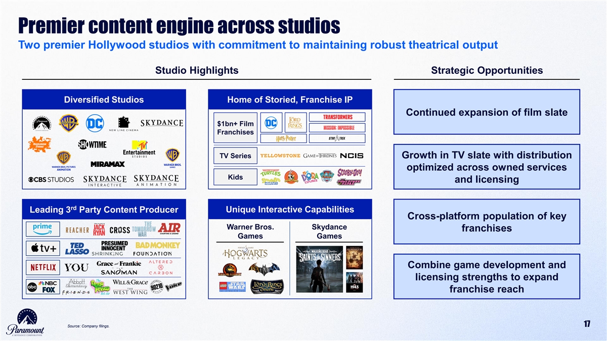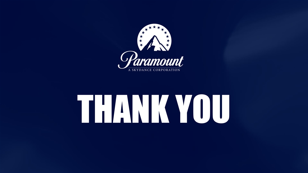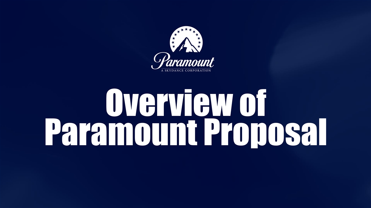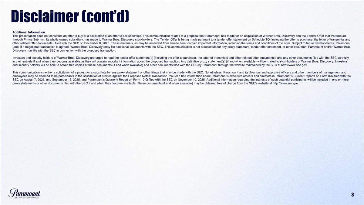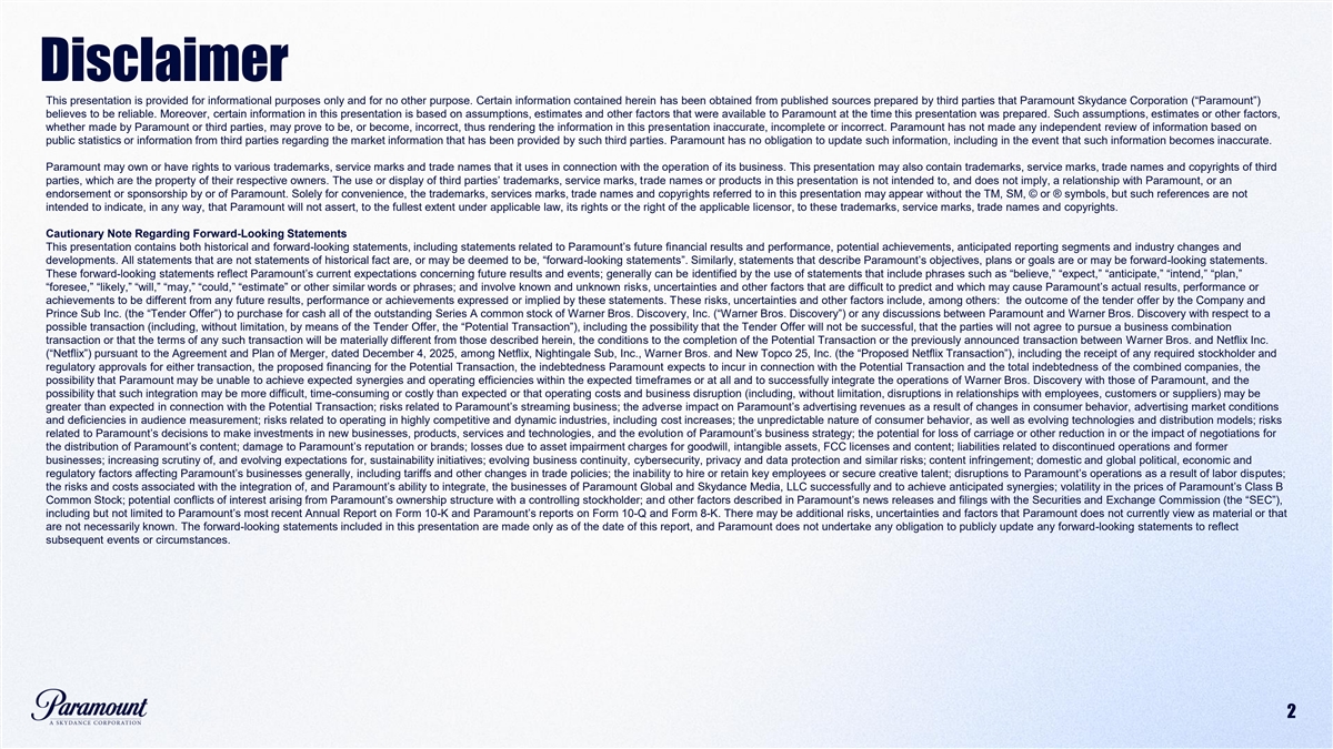 Disclaimer This presentation is provided for informational purposes only and for no other purpose. Certain information contained herein has been obtained from published sources prepared by third parties that Paramount Skydance Corporation (“Paramount”) believes to be reliable. Moreover, certain information in this presentation is based on assumptions, estimates and other factors that were available to Paramount at the time this presentation was prepared. Such assumptions, estimates or other factors, whether made by Paramount or third parties, may prove to be, or become, incorrect, thus rendering the information in this presentation inaccurate, incomplete or incorrect. Paramount has not made any independent review of information based on public statistics or information from third parties regarding the market information that has been provided by such third parties. Paramount has no obligation to update such information, including in the event that such information becomes inaccurate. Paramount may own or have rights to various trademarks, service marks and trade names that it uses in connection with the operation of its business. This presentation may also contain trademarks, service marks, trade names and copyrights of third parties, which are the property of their respective owners. The use or display of third parties’ trademarks, service marks, trade names or products in this presentation is not intended to, and does not imply, a relationship with Paramount, or an endorsement or sponsorship by or of Paramount. Solely for convenience, the trademarks, services marks, trade names and copyrights referred to in this presentation may appear without the TM, SM, © or ® symbols, but such references are not intended to indicate, in any way, that Paramount will not assert, to the fullest extent under applicable law, its rights or the right of the applicable licensor, to these trademarks, service marks, trade names and copyrights. Cautionary Note Regarding Forward-Looking Statements This presentation contains both historical and forward-looking statements, including statements related to Paramount’s future financial results and performance, potential achievements, anticipated reporting segments and industry changes and developments. All statements that are not statements of historical fact are, or may be deemed to be, “forward-looking statements”. Similarly, statements that describe Paramount’s objectives, plans or goals are or may be forward-looking statements. These forward-looking statements reflect Paramount’s current expectations concerning future results and events; generally can be identified by the use of statements that include phrases such as “believe,” “expect,” “anticipate,” “intend,” “plan,” “foresee,” “likely,” “will,” “may,” “could,” “estimate” or other similar words or phrases; and involve known and unknown risks, uncertainties and other factors that are difficult to predict and which may cause Paramount’s actual results, performance or achievements to be different from any future results, performance or achievements expressed or implied by these statements. These risks, uncertainties and other factors include, among others: the outcome of the tender offer by the Company and Prince Sub Inc. (the “Tender Offer”) to purchase for cash all of the outstanding Series A common stock of Warner Bros. Discovery, Inc. (“Warner Bros. Discovery”) or any discussions between Paramount and Warner Bros. Discovery with respect to a possible transaction (including, without limitation, by means of the Tender Offer, the “Potential Transaction”), including the possibility that the Tender Offer will not be successful, that the parties will not agree to pursue a business combination transaction or that the terms of any such transaction will be materially different from those described herein, the conditions to the completion of the Potential Transaction or the previously announced transaction between Warner Bros. and Netflix Inc. (“Netflix”) pursuant to the Agreement and Plan of Merger, dated December 4, 2025, among Netflix, Nightingale Sub, Inc., Warner Bros. and New Topco 25, Inc. (the “Proposed Netflix Transaction”), including the receipt of any required stockholder and regulatory approvals for either transaction, the proposed financing for the Potential Transaction, the indebtedness Paramount expects to incur in connection with the Potential Transaction and the total indebtedness of the combined companies, the possibility that Paramount may be unable to achieve expected synergies and operating efficiencies within the expected timeframes or at all and to successfully integrate the operations of Warner Bros. Discovery with those of Paramount, and the possibility that such integration may be more difficult, time-consuming or costly than expected or that operating costs and business disruption (including, without limitation, disruptions in relationships with employees, customers or suppliers) may be greater than expected in connection with the Potential Transaction; risks related to Paramount’s streaming business; the adverse impact on Paramount’s advertising revenues as a result of changes in consumer behavior, advertising market conditions and deficiencies in audience measurement; risks related to operating in highly competitive and dynamic industries, including cost increases; the unpredictable nature of consumer behavior, as well as evolving technologies and distribution models; risks related to Paramount’s decisions to make investments in new businesses, products, services and technologies, and the evolution of Paramount’s business strategy; the potential for loss of carriage or other reduction in or the impact of negotiations for the distribution of Paramount’s content; damage to Paramount’s reputation or brands; losses due to asset impairment charges for goodwill, intangible assets, FCC licenses and con