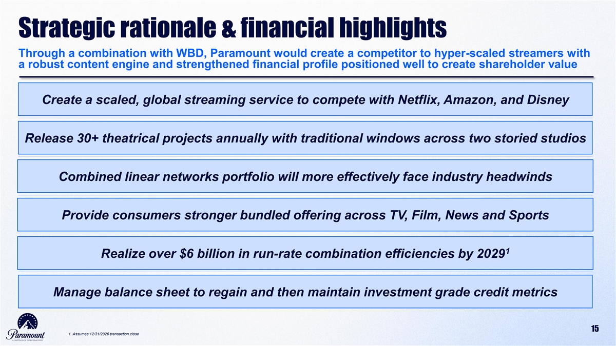 Overview of Paramount’s proposal Paramount is offering WBD shareholders $30.00 per share in cash, with all-cash funding fully backstopped by the Ellison Family Trust and RedBird Capital Partners • $30.00 per share of Warner Bros. Discovery, Inc. (“WBD”) Series A common stock • Total equity value of $77.9 billion Valuation • Enterprise value of $108.4 billion (including the assumption of net debt and noncontrolling interest) • 100% of the assets owned by WBD Scope • Including both Streaming & Studios and Linear Networks businesses • 100% cash Consideration • $40.7 billion of new cash funding − 100% backstopped by the Ellison Family Trust, supported by $250bn+ of Oracle stock, in addition to billions of dollars of other assets, and RedBird Capital Partners Sources of • $54.0 billion bridge loan Capital − Fully committed bridge loan facility from Bank of America, Citi, and Apollo, with use of proceeds including refinancing WBD’s existing bridge loan • Anticipate offering existing PSKY shareholders the opportunity to invest alongside new capital 14