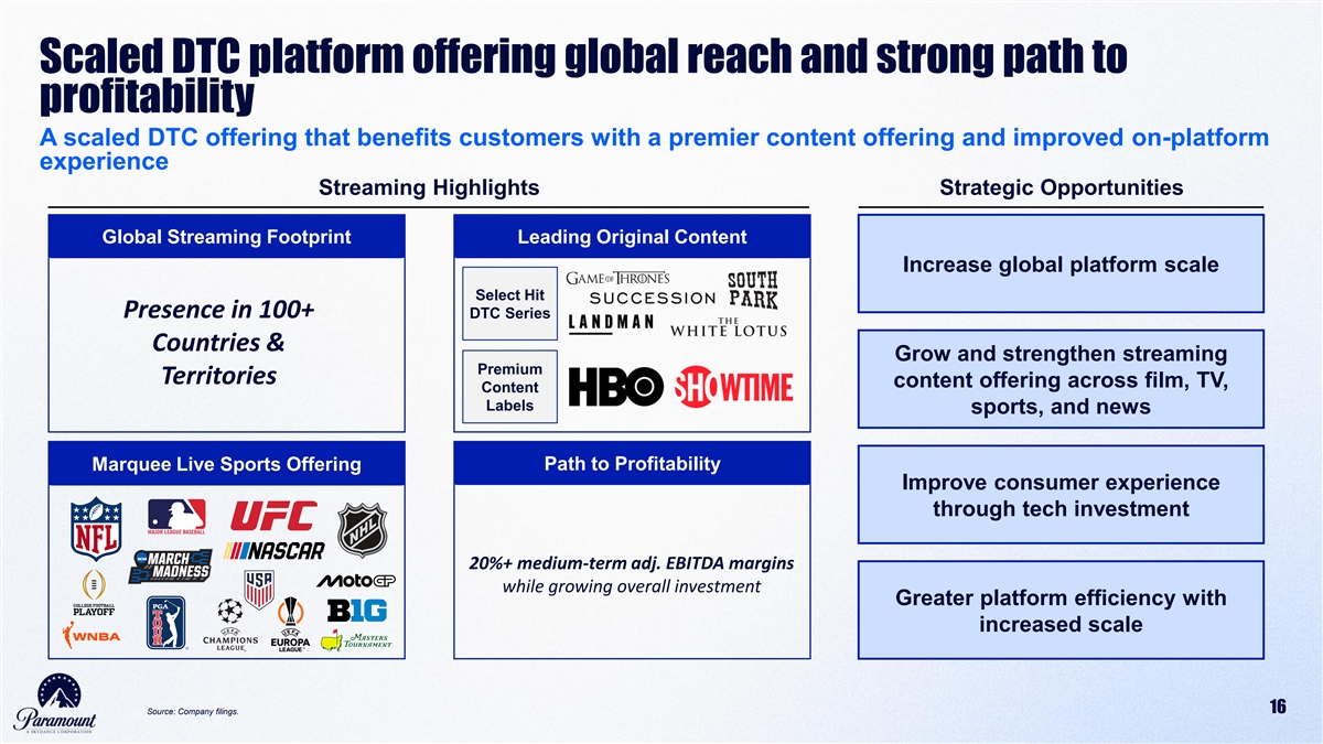 Strategic rationale & financial highlights Through a combination with WBD, Paramount would create a competitor to hyper-scaled streamers with a robust content engine and strengthened financial profile positioned well to create shareholder value Create a scaled, global streaming service to compete with Netflix, Amazon, and Disney Release 30+ theatrical projects annually with traditional windows across two storied studios Combined linear networks portfolio will more effectively face industry headwinds Provide consumers stronger bundled offering across TV, Film, News and Sports 1 Realize over $6 billion in run-rate combination efficiencies by 2029 Manage balance sheet to regain and then maintain investment grade credit metrics 15 1. Assumes 12/31/2026 transaction close