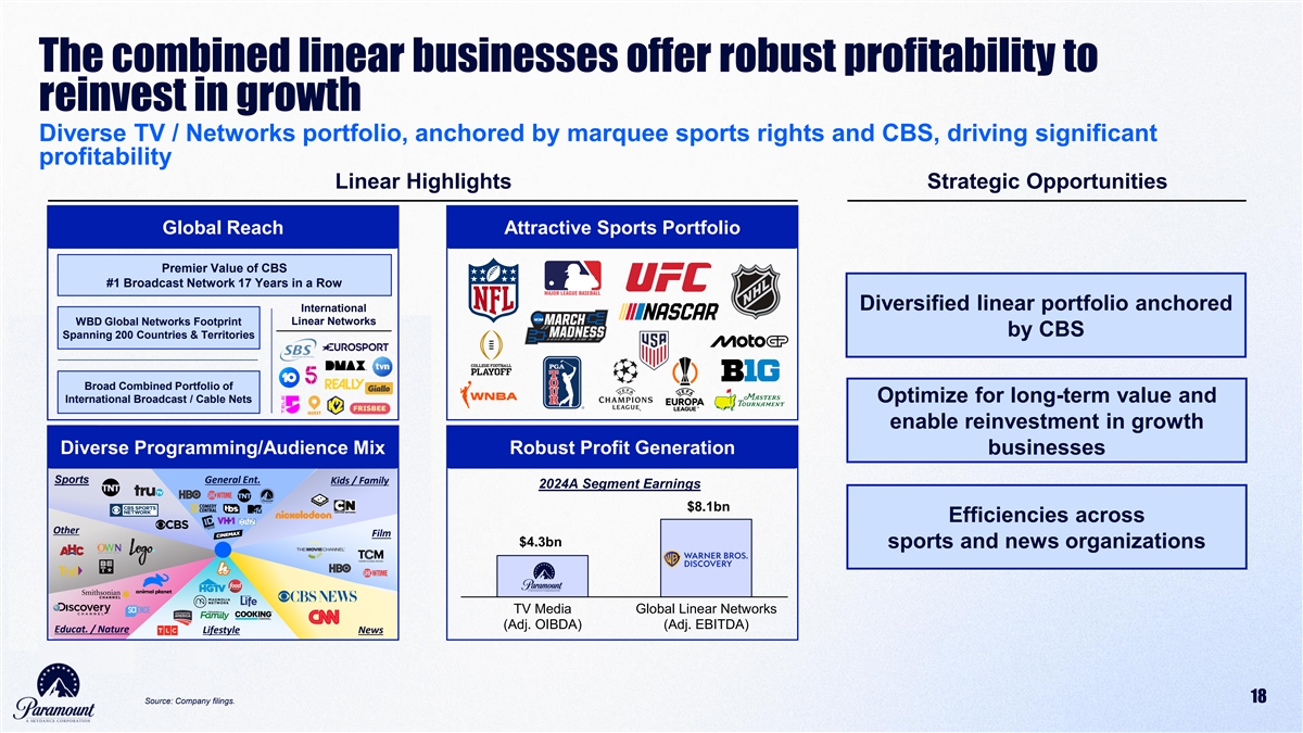 Premier content engine across studios Two premier Hollywood studios with commitment to maintaining robust theatrical output Studio Highlights Strategic Opportunities Diversified Studios Home of Storied, Franchise IP Continued expansion of film slate $1bn+ Film Franchises TV Series Growth in TV slate with distribution optimized across owned services Kids and licensing rd Leading 3 Party Content Producer Unique Interactive Capabilities Cross-platform population of key Warner Bros. Skydance franchises Games Games Combine game development and licensing strengths to expand franchise reach 17 Source: Company filings.