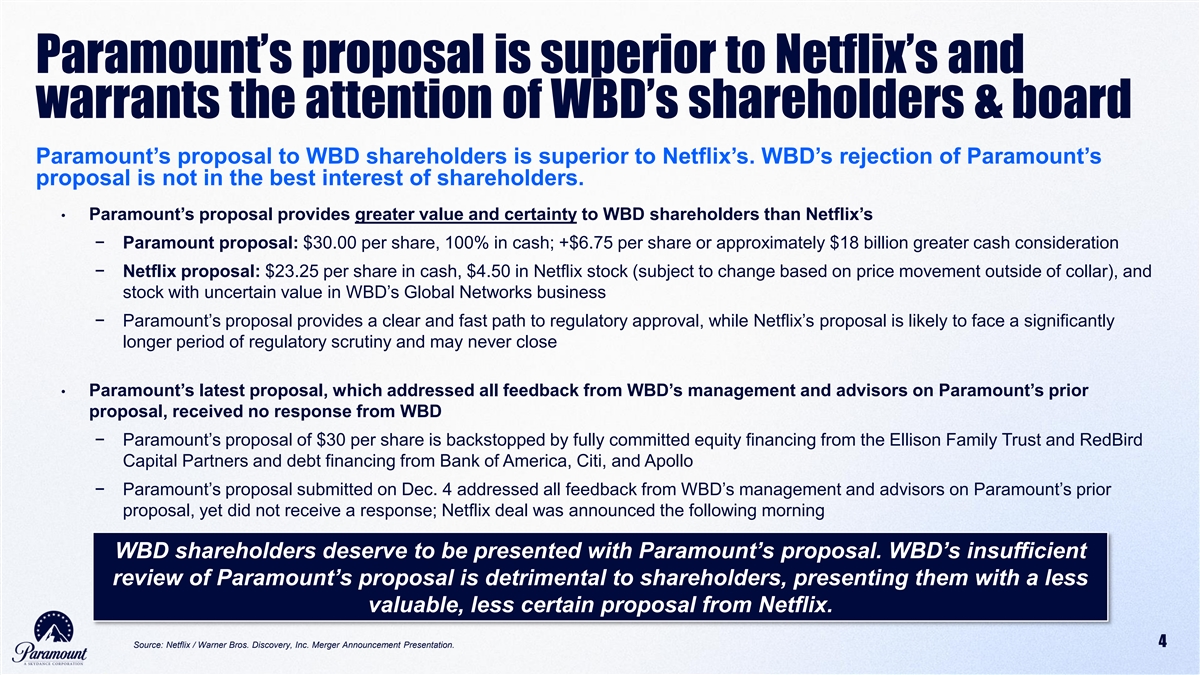 Disclaimer (cont’d) Additional Information This presentation does not constitute an offer to buy or a solicitation of an offer to sell securities. This communication relates to a proposal that Paramount has made for an acquisition of Warner Bros. Discovery and the Tender Offer that Paramount, through Prince Sub Inc., its wholly owned subsidiary, has made to Warner Bros. Discovery stockholders. The Tender Offer is being made pursuant to a tender offer statement on Schedule TO (including the offer to purchase, the letter of transmittal and other related offer documents), filed with the SEC on December 8, 2025. These materials, as may be amended from time to time, contain important information, including the terms and conditions of the offer. Subject to future developments, Paramount (and, if a negotiated transaction is agreed, Warner Bros. Discovery) may file additional documents with the SEC. This communication is not a substitute for any proxy statement, tender offer statement, or other document Paramount and/or Warner Bros. Discovery may file with the SEC in connection with the proposed transaction. Investors and security holders of Warner Bros. Discovery are urged to read the tender offer statement(s) (including the offer to purchase, the letter of transmittal and other related offer documents), and any other documents filed with the SEC carefully in their entirety if and when they become available as they will contain important information about the proposed transaction. Any definitive proxy statement(s) (if and when available) will be mailed to stockholders of Warner Bros. Discovery. Investors and security holders will be able to obtain free copies of these documents (if and when available) and other documents filed with the SEC by Paramount through the website maintained by the SEC at http://www.sec.gov. This communication is neither a solicitation of a proxy nor a substitute for any proxy statement or other filings that may be made with the SEC. Nonetheless, Paramount and its directors and executive officers and other members of management and employees may be deemed to be participants in the solicitation of proxies against the Proposed Netflix Transaction. You can find information about Paramount’s executive officers and directors in Paramount’s Current Reports on Form 8-K filed with the SEC on August 7, 2025, and September 16, 2025, and Paramount’s Quarterly Report on Form 10-Q filed with the SEC on November 10, 2025. Additional information regarding the interests of such potential participants will be included in one or more proxy statements or other documents filed with the SEC if and when they become available. These documents (if and when available) may be obtained free of charge from the SEC’s website at http://www.sec.gov. 3