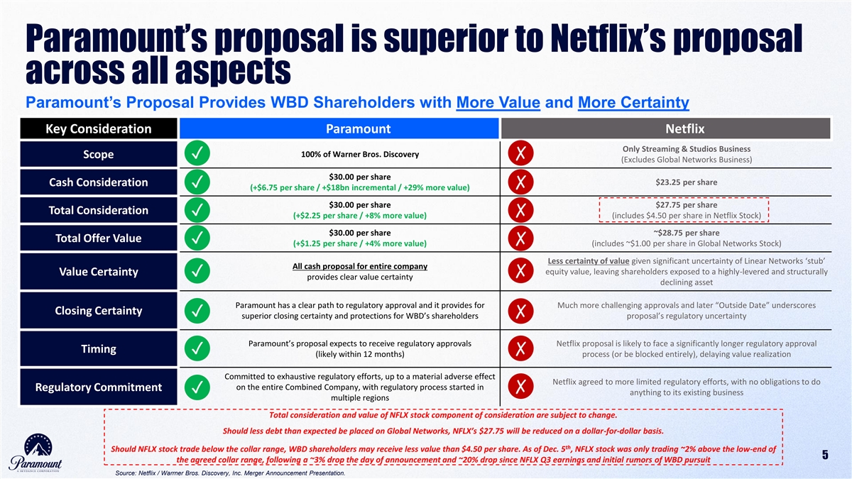 Paramount’s proposal is superior to Netflix’s and warrants the attention of WBD’s shareholders & board Paramount’s proposal to WBD shareholders is superior to Netflix’s. WBD’s rejection of Paramount’s proposal is not in the best interest of shareholders. • Paramount’s proposal provides greater value and certainty to WBD shareholders than Netflix’s 1 − Paramount proposal: $30.00 per share, 100% in cash; +$6.75 per share or approximately $18 billion greater cash consideration − Netflix proposal: $23.25 per share in cash, $4.50 in Netflix stock (subject to change based on price movement outside of collar), and stock with uncertain value in WBD’s Global Networks business 2 − Paramount’s proposal provides a clear and fast path to regulatory approval, while Netflix’s proposal is likely to face a significantly longer period of regulatory scrutiny and may never close • Paramount’s latest proposal, which addressed all feedback from WBD’s management and advisors on Paramount’s prior proposal, received no response from WBD 3 − Paramount’s proposal of $30 per share is backstopped by fully committed equity financing from the Ellison Family Trust and RedBird Capital Partners and debt financing from Bank of America, Citi, and Apollo − Paramount’s proposal submitted on Dec. 4 addressed all feedback from WBD’s management and advisors on Paramount’s prior proposal, yet did not receive a response; Netflix deal was announced the following morning WBD shareholders deserve to be presented with Paramount’s proposal. WBD’s insufficient review of Paramount’s proposal is detrimental to shareholders, presenting them with a less valuable, less certain proposal from Netflix. Source: Netflix / Warner Bros. Discovery, Inc. Merger Announcement Presentation. 4