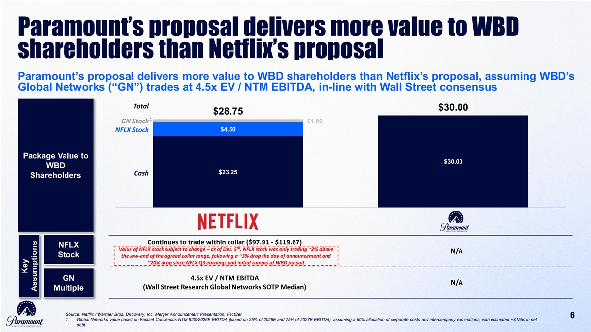 Paramount’s proposal is superior to Netflix’s proposal across all aspects Paramount’s Proposal Provides WBD Shareholders with More Value and More Certainty Key Consideration Paramount Netflix Only Streaming & Studios Business 100% of Warner Bros. Discovery Scope✓✗ (Excludes Global Networks Business) $30.00 per share $23.25 per share Cash Consideration ✓✗ (+$6.75 per share / +$18bn incremental / +29% more value) $30.00 per share $27.75 per share Total Consideration ✓✗ (+$2.25 per share / +8% more value) (includes $4.50 per share in Netflix Stock) $30.00 per share ~$28.75 per share Total Offer Value ✓✗ (+$1.25 per share / +4% more value) (includes ~$1.00 per share in Global Networks Stock) Less certainty of value given significant uncertainty of Linear Networks ‘stub’ All cash proposal for entire company equity value, leaving shareholders exposed to a highly-levered and structurally Value Certainty✗ ✓ provides clear value certainty declining asset Paramount has a clear path to regulatory approval and it provides for Much more challenging approvals and later “Outside Date” underscores Closing Certainty ✓✗ superior closing certainty and protections for WBD’s shareholders proposal’s regulatory uncertainty Paramount’s proposal expects to receive regulatory approvals Netflix proposal is likely to face a significantly longer regulatory approval Timing ✓✗ (likely within 12 months) process (or be blocked entirely), delaying value realization Committed to exhaustive regulatory efforts, up to a material adverse effect Netflix agreed to more limited regulatory efforts, with no obligations to do on the entire Combined Company, with regulatory process started in Regulatory Commitment ✗ ✓ anything to its existing business multiple regions Total consideration and value of NFLX stock component of consideration are subject to change. Should less debt than expected be placed on Global Networks, NFLX’s $27.75 will be reduced on a dollar-for-dollar basis. th Should NFLX stock trade below the collar range, WBD shareholders may receive less value than $4.50 per share. As of Dec. 5 , NFLX stock was only trading ~2% above the low-end of 5 the agreed collar range, following a ~3% drop the day of announcement and ~20% drop since NFLX Q3 earnings and initial rumors of WBD pursuit Source: Netflix / Warrner Bros. Discovery, Inc. Merger Announcement Presentation.