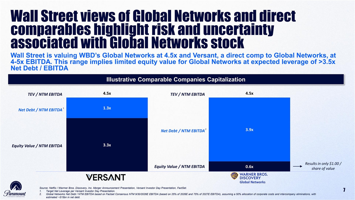 Paramount’s proposal delivers more value to WBD shareholders than Netflix’s proposal Paramount’s proposal delivers more value to WBD shareholders than Netflix’s proposal, assuming WBD’s Global Networks (“GN”) trades at 4.5x EV / NTM EBITDA, in-line with Wall Street consensus Total $30.00 $28.75 1 $1.00 GN Stock $4.50 NFLX Stock Package Value to $30.00 WBD $23.25 Cash Cash Shareholders Continues to trade within collar ($97.91 - $119.67) NFLX th Value of NFLX stock subject to change – as of Dec. 5 , NFLX stock was only trading ~2% above N/A Stock the low-end of the agreed collar range, following a ~3% drop the day of announcement and ~20% drop since NFLX Q3 earnings and initial rumors of WBD pursuit 4.5x EV / NTM EBITDA GN N/A (Wall Street Research Global Networks SOTP Median) Multiple Source: Netflix / Warrner Bros. Discovery, Inc. Merger Announcement Presentation, FactSet. 6 1. Global Networks value based on Factset Consensus NTM 9/30/2026E EBITDA (based on 25% of 2026E and 75% of 2027E EBITDA), assuming a 50% allocation of corporate costs and intercompany eliminations, with estimated ~$15bn in net debt. Key Assumptions