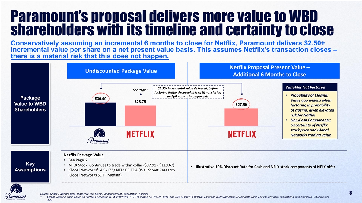 Wall Street views of Global Networks and direct comparables highlight risk and uncertainty associated with Global Networks stock Wall Street is valuing WBD’s Global Networks at 4.5x and Versant, a direct comp to Global Networks, at 4-5x EBITDA. This range implies limited equity value for Global Networks at expected leverage of >3.5x Net Debt / EBITDA Illustrative Comparable Companies Capitalization 4.5x 4.5x TEV / NTM EBITDA TEV / NTM EBITDA 1 1.3x Net Debt / NTM EBITDA 2 3.9x Net Debt / NTM EBITDA 3.3x Equity Value / NTM EBITDA Results in only $1.00 / Equity Value / NTM EBITDA 0.6x share of value Global Networks Source: Netflix / Warrner Bros. Discovery, Inc. Merger Announcement Presentation, Versant Investor Day Presentation, FactSet. 1. Target Net Leverage per Versant Investor Day Presentation. 7 2. Global Networks Net Debt / NTM EBITDA based on Factset Consensus NTM 9/30/2026E EBITDA (based on 25% of 2026E and 75% of 2027E EBITDA), assuming a 50% allocation of corporate costs and intercompany eliminations, with estimated ~$15bn in net debt.