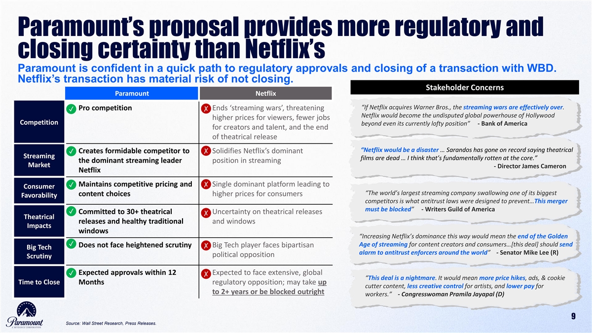 Paramount’s proposal delivers more value to WBD shareholders with its timeline and certainty to close Conservatively assuming an incremental 6 months to close for Netflix, Paramount delivers $2.50+ incremental value per share on a net present value basis. This assumes Netflix’s transaction closes – there is a material risk that this does not happen. Netflix Proposal Present Value – Undiscounted Package Value Additional 6 Months to Close Variables Not Factored $2.50+ incremental value delivered, before See Page 6 factoring Netflix Proposal risks of (i) not closing • Probability of Closing: and (ii) non-cash components Package $30.00 Value gap widens when $28.75 Value to WBD $27.50 factoring in probability Shareholders of closing, given elevated risk for Netflix • Non-Cash Components: Uncertainty of Netflix stock price and Global Networks trading value Netflix Package Value • See Page 6 Key • NFLX Stock: Continues to trade within collar ($97.91 - $119.67) • Illustrative 10% Discount Rate for Cash and NFLX stock components of NFLX offer 1 Assumptions • Global Networks : 4.5x EV / NTM EBITDA (Wall Street Research Global Networks SOTP Median) Source: Netflix / Warrner Bros. Discovery, Inc. Merger Announcement Presentation, FactSet. 8 1. Global Networks value based on Factset Consensus NTM 9/30/2026E EBITDA (based on 25% of 2026E and 75% of 2027E EBITDA), assuming a 50% allocation of corporate costs and intercompany eliminations, with estimated ~$15bn in net debt.