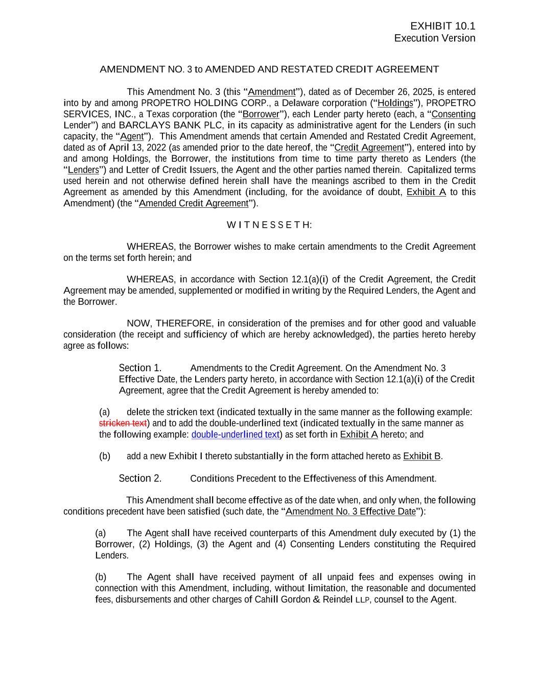 Execution Version AMENDMENT NO. 3 to AMENDED AND RESTATED CREDIT AGREEMENT This Amendment No. 3 (this “Amendment”), dated as of December 26, 2025, is entered into by and among PROPETRO HOLDING CORP., a Delaware corporation (“Holdings”), PROPETRO SERVICES, INC., a Texas corporation (the “Borrower”), each Lender party hereto (each, a “Consenting Lender”) and BARCLAYS BANK PLC, in its capacity as administrative agent for the Lenders (in such capacity, the “Agent”). This Amendment amends that certain Amended and Restated Credit Agreement, dated as of April 13, 2022 (as amended prior to the date hereof, the “Credit Agreement”), entered into by and among Holdings, the Borrower, the institutions from time to time party thereto as Lenders (the “Lenders”) and Letter of Credit Issuers, the Agent and the other parties named therein. Capitalized terms used herein and not otherwise defined herein shall have the meanings ascribed to them in the Credit Agreement as amended by this Amendment (including, for the avoidance of doubt, Exhibit A to this Amendment) (the “Amended Credit Agreement”). W I T N E S S E T H: WHEREAS, the Borrower wishes to make certain amendments to the Credit Agreement on the terms set forth herein; and WHEREAS, in accordance with Section 12.1(a)(i) of the Credit Agreement, the Credit Agreement may be amended, supplemented or modified in writing by the Required Lenders, the Agent and the Borrower. NOW, THEREFORE, in consideration of the premises and for other good and valuable consideration (the receipt and sufficiency of which are hereby acknowledged), the parties hereto hereby agree as follows: Section 1. Amendments to the Credit Agreement. On the Amendment No. 3 Effective Date, the Lenders party hereto, in accordance with Section 12.1(a)(i) of the Credit Agreement, agree that the Credit Agreement is hereby amended to: (a) delete the stricken text (indicated textually in the same manner as the following example: stricken text) and to add the double-underlined text (indicated textually in the same manner as the following example: double-underlined text) as set forth in Exhibit A hereto; and (b) add a new Exhibit I thereto substantially in the form attached hereto as Exhibit B. Section 2. Conditions Precedent to the Effectiveness of this Amendment. This Amendment shall become effective as of the date when, and only when, the following conditions precedent have been satisfied (such date, the “Amendment No. 3 Effective Date”): (a) The Agent shall have received counterparts of this Amendment duly executed by (1) the Borrower, (2) Holdings, (3) the Agent and (4) Consenting Lenders constituting the Required Lenders. (b) The Agent shall have received payment of all unpaid fees and expenses owing in connection with this Amendment, including, without limitation, the reasonable and documented fees, disbursements and other charges of Cahill Gordon & Reindel LLP, counsel to the Agent. EXHIBIT 10.1