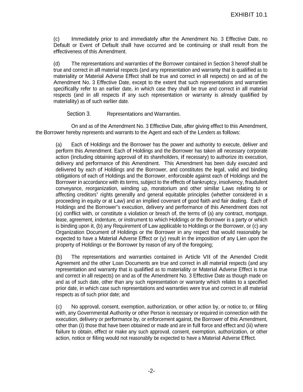 -2- (c) Immediately prior to and immediately after the Amendment No. 3 Effective Date, no Default or Event of Default shall have occurred and be continuing or shall result from the effectiveness of this Amendment. (d) The representations and warranties of the Borrower contained in Section 3 hereof shall be true and correct in all material respects (and any representation and warranty that is qualified as to materiality or Material Adverse Effect shall be true and correct in all respects) on and as of the Amendment No. 3 Effective Date, except to the extent that such representations and warranties specifically refer to an earlier date, in which case they shall be true and correct in all material respects (and in all respects if any such representation or warranty is already qualified by materiality) as of such earlier date. Section 3. Representations and Warranties. On and as of the Amendment No. 3 Effective Date, after giving effect to this Amendment, the Borrower hereby represents and warrants to the Agent and each of the Lenders as follows: (a) Each of Holdings and the Borrower has the power and authority to execute, deliver and perform this Amendment. Each of Holdings and the Borrower has taken all necessary corporate action (including obtaining approval of its shareholders, if necessary) to authorize its execution, delivery and performance of this Amendment. This Amendment has been duly executed and delivered by each of Holdings and the Borrower, and constitutes the legal, valid and binding obligations of each of Holdings and the Borrower, enforceable against each of Holdings and the Borrower in accordance with its terms, subject to the effects of bankruptcy, insolvency, fraudulent conveyance, reorganization, winding up, moratorium and other similar Laws relating to or affecting creditors’ rights generally and general equitable principles (whether considered in a proceeding in equity or at Law) and an implied covenant of good faith and fair dealing. Each of Holdings and the Borrower’s execution, delivery and performance of this Amendment does not (x) conflict with, or constitute a violation or breach of, the terms of (a) any contract, mortgage, lease, agreement, indenture, or instrument to which Holdings or the Borrower is a party or which is binding upon it, (b) any Requirement of Law applicable to Holdings or the Borrower, or (c) any Organization Document of Holdings or the Borrower in any respect that would reasonably be expected to have a Material Adverse Effect or (y) result in the imposition of any Lien upon the property of Holdings or the Borrower by reason of any of the foregoing; (b) The representations and warranties contained in Article VII of the Amended Credit Agreement and the other Loan Documents are true and correct in all material respects (and any representation and warranty that is qualified as to materiality or Material Adverse Effect is true and correct in all respects) on and as of the Amendment No. 3 Effective Date as though made on and as of such date, other than any such representation or warranty which relates to a specified prior date, in which case such representations and warranties were true and correct in all material respects as of such prior date; and (c) No approval, consent, exemption, authorization, or other action by, or notice to, or filing with, any Governmental Authority or other Person is necessary or required in connection with the execution, delivery or performance by, or enforcement against, the Borrower of this Amendment, other than (i) those that have been obtained or made and are in full force and effect and (ii) where failure to obtain, effect or make any such approval, consent, exemption, authorization, or other action, notice or filing would not reasonably be expected to have a Material Adverse Effect. EXHIBIT 10.1