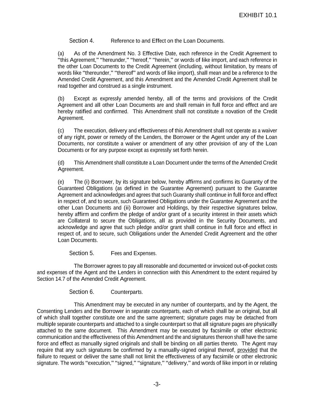 -3- Section 4. Reference to and Effect on the Loan Documents. (a) As of the Amendment No. 3 Effective Date, each reference in the Credit Agreement to “this Agreement,” “hereunder,” “hereof,” “herein,” or words of like import, and each reference in the other Loan Documents to the Credit Agreement (including, without limitation, by means of words like “thereunder,” “thereof” and words of like import), shall mean and be a reference to the Amended Credit Agreement, and this Amendment and the Amended Credit Agreement shall be read together and construed as a single instrument. (b) Except as expressly amended hereby, all of the terms and provisions of the Credit Agreement and all other Loan Documents are and shall remain in full force and effect and are hereby ratified and confirmed. This Amendment shall not constitute a novation of the Credit Agreement. (c) The execution, delivery and effectiveness of this Amendment shall not operate as a waiver of any right, power or remedy of the Lenders, the Borrower or the Agent under any of the Loan Documents, nor constitute a waiver or amendment of any other provision of any of the Loan Documents or for any purpose except as expressly set forth herein. (d) This Amendment shall constitute a Loan Document under the terms of the Amended Credit Agreement. (e) The (i) Borrower, by its signature below, hereby affirms and confirms its Guaranty of the Guaranteed Obligations (as defined in the Guarantee Agreement) pursuant to the Guarantee Agreement and acknowledges and agrees that such Guaranty shall continue in full force and effect in respect of, and to secure, such Guaranteed Obligations under the Guarantee Agreement and the other Loan Documents and (ii) Borrower and Holdings, by their respective signatures below, hereby affirm and confirm the pledge of and/or grant of a security interest in their assets which are Collateral to secure the Obligations, all as provided in the Security Documents, and acknowledge and agree that such pledge and/or grant shall continue in full force and effect in respect of, and to secure, such Obligations under the Amended Credit Agreement and the other Loan Documents. Section 5. Fees and Expenses. The Borrower agrees to pay all reasonable and documented or invoiced out-of-pocket costs and expenses of the Agent and the Lenders in connection with this Amendment to the extent required by Section 14.7 of the Amended Credit Agreement. Section 6. Counterparts. This Amendment may be executed in any number of counterparts, and by the Agent, the Consenting Lenders and the Borrower in separate counterparts, each of which shall be an original, but all of which shall together constitute one and the same agreement; signature pages may be detached from multiple separate counterparts and attached to a single counterpart so that all signature pages are physically attached to the same document. This Amendment may be executed by facsimile or other electronic communication and the effectiveness of this Amendment and the and signatures thereon shall have the same force and effect as manually signed originals and shall be binding on all parties thereto. The Agent may require that any such signatures be confirmed by a manually-signed original thereof, provided that the failure to request or deliver the same shall not limit the effectiveness of any facsimile or other electronic signature. The words “execution,” “signed,” “signature,” “delivery,” and words of like import in or relating EXHIBIT 10.1