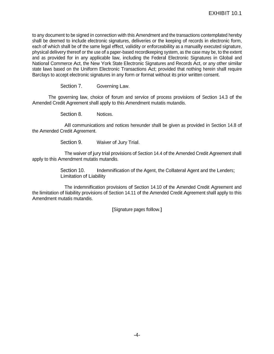 -4- to any document to be signed in connection with this Amendment and the transactions contemplated hereby shall be deemed to include electronic signatures, deliveries or the keeping of records in electronic form, each of which shall be of the same legal effect, validity or enforceability as a manually executed signature, physical delivery thereof or the use of a paper-based recordkeeping system, as the case may be, to the extent and as provided for in any applicable law, including the Federal Electronic Signatures in Global and National Commerce Act, the New York State Electronic Signatures and Records Act, or any other similar state laws based on the Uniform Electronic Transactions Act; provided that nothing herein shall require Barclays to accept electronic signatures in any form or format without its prior written consent. Section 7. Governing Law. The governing law, choice of forum and service of process provisions of Section 14.3 of the Amended Credit Agreement shall apply to this Amendment mutatis mutandis. Section 8. Notices. All communications and notices hereunder shall be given as provided in Section 14.8 of the Amended Credit Agreement. Section 9. Waiver of Jury Trial. The waiver of jury trial provisions of Section 14.4 of the Amended Credit Agreement shall apply to this Amendment mutatis mutandis. Section 10. Indemnification of the Agent, the Collateral Agent and the Lenders; Limitation of Liability The indemnification provisions of Section 14.10 of the Amended Credit Agreement and the limitation of liability provisions of Section 14.11 of the Amended Credit Agreement shall apply to this Amendment mutatis mutandis. [Signature pages follow.] EXHIBIT 10.1