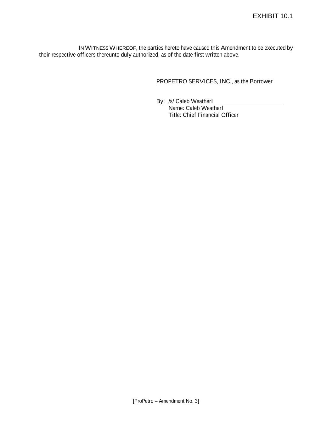 [ProPetro – Amendment No. 3] IN WITNESS WHEREOF, the parties hereto have caused this Amendment to be executed by their respective officers thereunto duly authorized, as of the date first written above. PROPETRO SERVICES, INC., as the Borrower By: /s/ Caleb Weatherl Name: Caleb Weatherl Title: Chief Financial Officer EXHIBIT 10.1