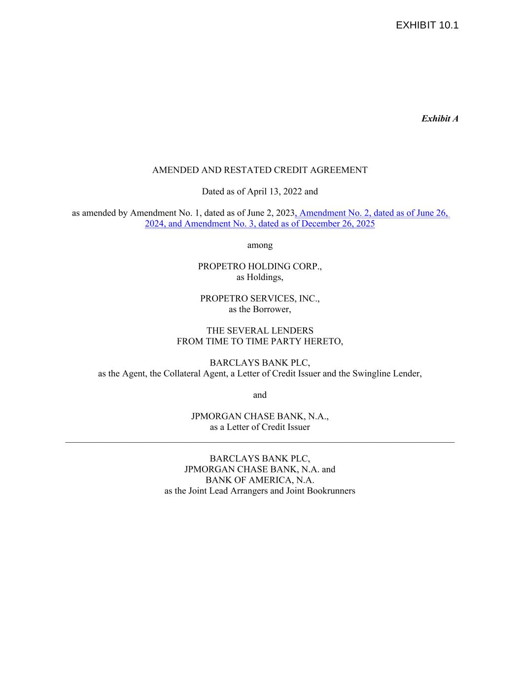 Exhibit A AMENDED AND RESTATED CREDIT AGREEMENT Dated as of April 13, 2022 and as amended by Amendment No. 1, dated as of June 2, 2023, Amendment No. 2, dated as of June 26, 2024, and Amendment No. 3, dated as of December 26, 2025 among PROPETRO HOLDING CORP., as Holdings, PROPETRO SERVICES, INC., as the Borrower, THE SEVERAL LENDERS FROM TIME TO TIME PARTY HERETO, BARCLAYS BANK PLC, as the Agent, the Collateral Agent, a Letter of Credit Issuer and the Swingline Lender, and JPMORGAN CHASE BANK, N.A., as a Letter of Credit Issuer ___________________________________________________________________________________ BARCLAYS BANK PLC, JPMORGAN CHASE BANK, N.A. and BANK OF AMERICA, N.A. as the Joint Lead Arrangers and Joint Bookrunners EXHIBIT 10.1
