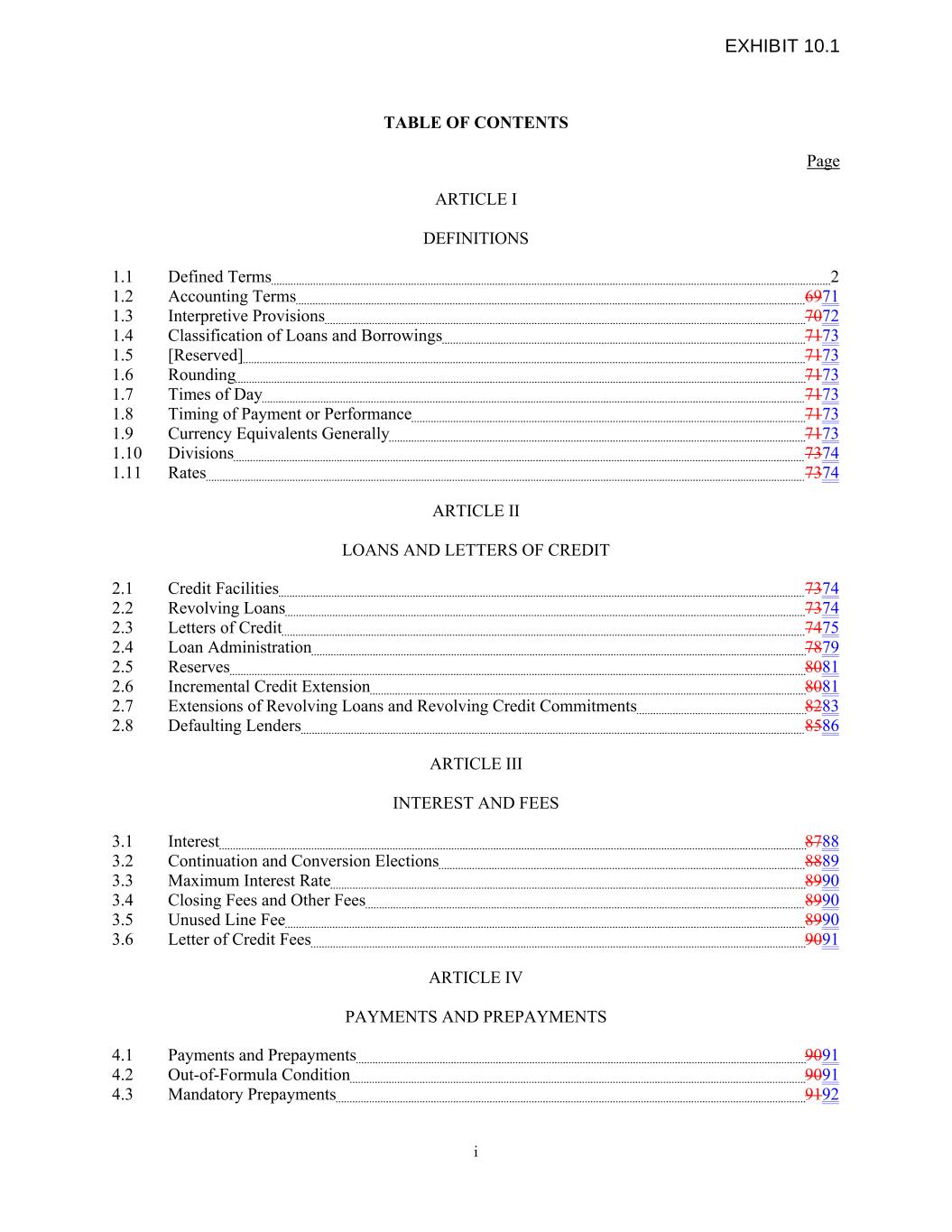 TABLE OF CONTENTS Page ARTICLE I DEFINITIONS 1.1 Defined Terms 2 1.2 Accounting Terms 6971 1.3 Interpretive Provisions 7072 1.4 Classification of Loans and Borrowings 7173 1.5 [Reserved] 7173 1.6 Rounding 7173 1.7 Times of Day 7173 1.8 Timing of Payment or Performance 7173 1.9 Currency Equivalents Generally 7173 1.10 Divisions 7374 1.11 Rates 7374 ARTICLE II LOANS AND LETTERS OF CREDIT 2.1 Credit Facilities 7374 2.2 Revolving Loans 7374 2.3 Letters of Credit 7475 2.4 Loan Administration 7879 2.5 Reserves 8081 2.6 Incremental Credit Extension 8081 2.7 Extensions of Revolving Loans and Revolving Credit Commitments 8283 2.8 Defaulting Lenders 8586 ARTICLE III INTEREST AND FEES 3.1 Interest 8788 3.2 Continuation and Conversion Elections 8889 3.3 Maximum Interest Rate 8990 3.4 Closing Fees and Other Fees 8990 3.5 Unused Line Fee 8990 3.6 Letter of Credit Fees 9091 ARTICLE IV PAYMENTS AND PREPAYMENTS 4.1 Payments and Prepayments 9091 4.2 Out-of-Formula Condition 9091 4.3 Mandatory Prepayments 9192 i EXHIBIT 10.1