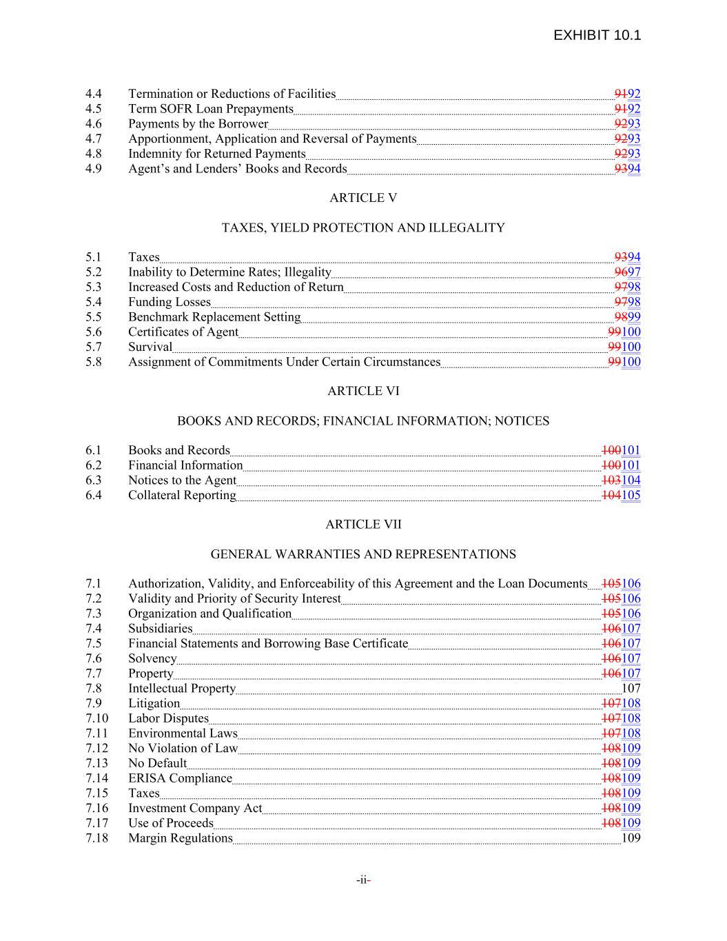 4.4 Termination or Reductions of Facilities 9192 4.5 Term SOFR Loan Prepayments 9192 4.6 Payments by the Borrower 9293 4.7 Apportionment, Application and Reversal of Payments 9293 4.8 Indemnity for Returned Payments 9293 4.9 Agent’s and Lenders’ Books and Records 9394 ARTICLE V TAXES, YIELD PROTECTION AND ILLEGALITY 5.1 Taxes 9394 5.2 Inability to Determine Rates; Illegality 9697 5.3 Increased Costs and Reduction of Return 9798 5.4 Funding Losses 9798 5.5 Benchmark Replacement Setting 9899 5.6 Certificates of Agent 99100 5.7 Survival 99100 5.8 Assignment of Commitments Under Certain Circumstances 99100 ARTICLE VI BOOKS AND RECORDS; FINANCIAL INFORMATION; NOTICES 6.1 Books and Records 100101 6.2 Financial Information 100101 6.3 Notices to the Agent 103104 6.4 Collateral Reporting 104105 ARTICLE VII GENERAL WARRANTIES AND REPRESENTATIONS 7.1 Authorization, Validity, and Enforceability of this Agreement and the Loan Documents 105106 7.2 Validity and Priority of Security Interest 105106 7.3 Organization and Qualification 105106 7.4 Subsidiaries 106107 7.5 Financial Statements and Borrowing Base Certificate 106107 7.6 Solvency 106107 7.7 Property 106107 7.8 Intellectual Property 107 7.9 Litigation 107108 7.10 Labor Disputes 107108 7.11 Environmental Laws 107108 7.12 No Violation of Law 108109 7.13 No Default 108109 7.14 ERISA Compliance 108109 7.15 Taxes 108109 7.16 Investment Company Act 108109 7.17 Use of Proceeds 108109 7.18 Margin Regulations 109 -ii- EXHIBIT 10.1