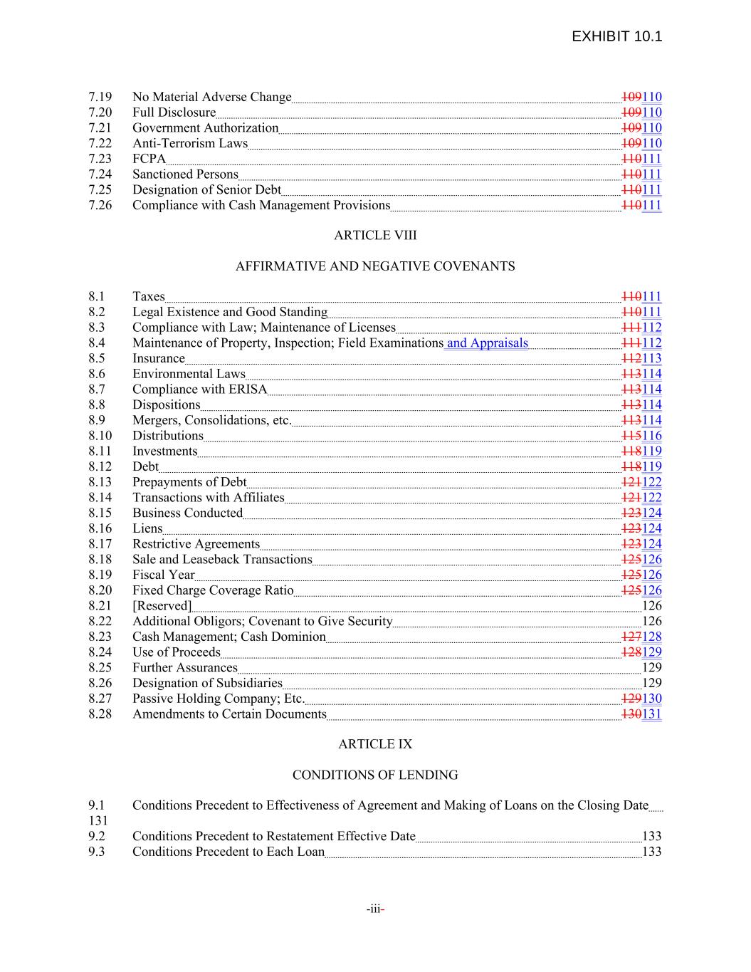 7.19 No Material Adverse Change 109110 7.20 Full Disclosure 109110 7.21 Government Authorization 109110 7.22 Anti-Terrorism Laws 109110 7.23 FCPA 110111 7.24 Sanctioned Persons 110111 7.25 Designation of Senior Debt 110111 7.26 Compliance with Cash Management Provisions 110111 ARTICLE VIII AFFIRMATIVE AND NEGATIVE COVENANTS 8.1 Taxes 110111 8.2 Legal Existence and Good Standing 110111 8.3 Compliance with Law; Maintenance of Licenses 111112 8.4 Maintenance of Property, Inspection; Field Examinations and Appraisals 111112 8.5 Insurance 112113 8.6 Environmental Laws 113114 8.7 Compliance with ERISA 113114 8.8 Dispositions 113114 8.9 Mergers, Consolidations, etc. 113114 8.10 Distributions 115116 8.11 Investments 118119 8.12 Debt 118119 8.13 Prepayments of Debt 121122 8.14 Transactions with Affiliates 121122 8.15 Business Conducted 123124 8.16 Liens 123124 8.17 Restrictive Agreements 123124 8.18 Sale and Leaseback Transactions 125126 8.19 Fiscal Year 125126 8.20 Fixed Charge Coverage Ratio 125126 8.21 [Reserved] 126 8.22 Additional Obligors; Covenant to Give Security 126 8.23 Cash Management; Cash Dominion 127128 8.24 Use of Proceeds 128129 8.25 Further Assurances 129 8.26 Designation of Subsidiaries 129 8.27 Passive Holding Company; Etc. 129130 8.28 Amendments to Certain Documents 130131 ARTICLE IX CONDITIONS OF LENDING 9.1 Conditions Precedent to Effectiveness of Agreement and Making of Loans on the Closing Date 131 9.2 Conditions Precedent to Restatement Effective Date 133 9.3 Conditions Precedent to Each Loan 133 -iii- EXHIBIT 10.1