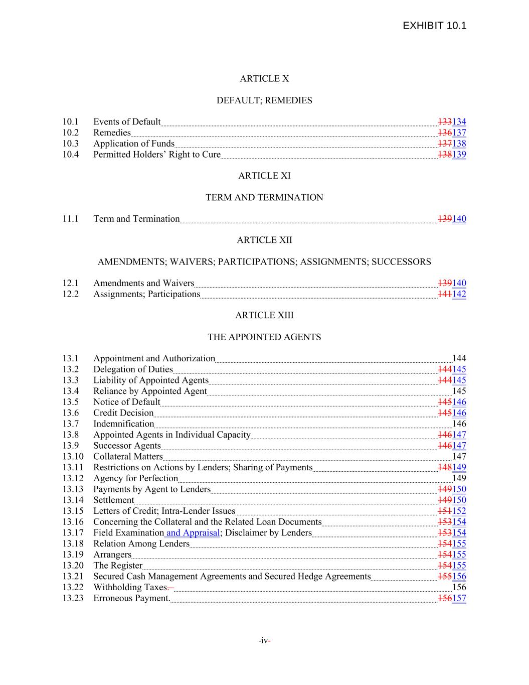 ARTICLE X DEFAULT; REMEDIES 10.1 Events of Default 133134 10.2 Remedies 136137 10.3 Application of Funds 137138 10.4 Permitted Holders’ Right to Cure 138139 ARTICLE XI TERM AND TERMINATION 11.1 Term and Termination 139140 ARTICLE XII AMENDMENTS; WAIVERS; PARTICIPATIONS; ASSIGNMENTS; SUCCESSORS 12.1 Amendments and Waivers 139140 12.2 Assignments; Participations 141142 ARTICLE XIII THE APPOINTED AGENTS 13.1 Appointment and Authorization 144 13.2 Delegation of Duties 144145 13.3 Liability of Appointed Agents 144145 13.4 Reliance by Appointed Agent 145 13.5 Notice of Default 145146 13.6 Credit Decision 145146 13.7 Indemnification 146 13.8 Appointed Agents in Individual Capacity 146147 13.9 Successor Agents 146147 13.10 Collateral Matters 147 13.11 Restrictions on Actions by Lenders; Sharing of Payments 148149 13.12 Agency for Perfection 149 13.13 Payments by Agent to Lenders 149150 13.14 Settlement 149150 13.15 Letters of Credit; Intra-Lender Issues 151152 13.16 Concerning the Collateral and the Related Loan Documents 153154 13.17 Field Examination and Appraisal; Disclaimer by Lenders 153154 13.18 Relation Among Lenders 154155 13.19 Arrangers 154155 13.20 The Register 154155 13.21 Secured Cash Management Agreements and Secured Hedge Agreements 155156 13.22 Withholding Taxes. 156 13.23 Erroneous Payment. 156157 -iv- EXHIBIT 10.1