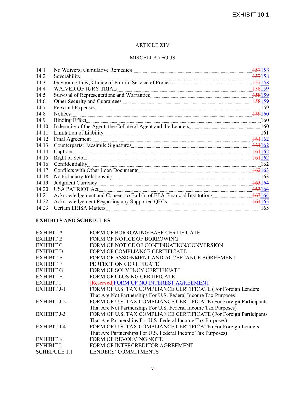 ARTICLE XIV MISCELLANEOUS 14.1 No Waivers; Cumulative Remedies 157158 14.2 Severability 157158 14.3 Governing Law; Choice of Forum; Service of Process 157158 14.4 WAIVER OF JURY TRIAL 158159 14.5 Survival of Representations and Warranties 158159 14.6 Other Security and Guarantees 158159 14.7 Fees and Expenses 159 14.8 Notices 159160 14.9 Binding Effect 160 14.10 Indemnity of the Agent, the Collateral Agent and the Lenders 160 14.11 Limitation of Liability 161 14.12 Final Agreement 161162 14.13 Counterparts; Facsimile Signatures 161162 14.14 Captions 161162 14.15 Right of Setoff 161162 14.16 Confidentiality 162 14.17 Conflicts with Other Loan Documents 162163 14.18 No Fiduciary Relationship 163 14.19 Judgment Currency 163164 14.20 USA PATRIOT Act 163164 14.21 Acknowledgement and Consent to Bail-In of EEA Financial Institutions 163164 14.22 Acknowledgement Regarding any Supported QFCs 164165 14.23 Certain ERISA Matters 165 EXHIBITS AND SCHEDULES EXHIBIT A FORM OF BORROWING BASE CERTIFICATE EXHIBIT B FORM OF NOTICE OF BORROWING EXHIBIT C FORM OF NOTICE OF CONTINUATION/CONVERSION EXHIBIT D FORM OF COMPLIANCE CERTIFICATE EXHIBIT E FORM OF ASSIGNMENT AND ACCEPTANCE AGREEMENT EXHIBIT F PERFECTION CERTIFICATE EXHIBIT G FORM OF SOLVENCY CERTIFICATE EXHIBIT H FORM OF CLOSING CERTIFICATE EXHIBIT I [Reserved]FORM OF NO INTEREST AGREEMENT EXHIBIT J-1 FORM OF U.S. TAX COMPLIANCE CERTIFICATE (For Foreign Lenders That Are Not Partnerships For U.S. Federal Income Tax Purposes) EXHIBIT J-2 FORM OF U.S. TAX COMPLIANCE CERTIFICATE (For Foreign Participants That Are Not Partnerships For U.S. Federal Income Tax Purposes) EXHIBIT J-3 FORM OF U.S. TAX COMPLIANCE CERTIFICATE (For Foreign Participants That Are Partnerships For U.S. Federal Income Tax Purposes) EXHIBIT J-4 FORM OF U.S. TAX COMPLIANCE CERTIFICATE (For Foreign Lenders That Are Partnerships For U.S. Federal Income Tax Purposes) EXHIBIT K FORM OF REVOLVING NOTE EXHIBIT L FORM OF INTERCREDITOR AGREEMENT SCHEDULE 1.1 LENDERS’ COMMITMENTS -v- EXHIBIT 10.1