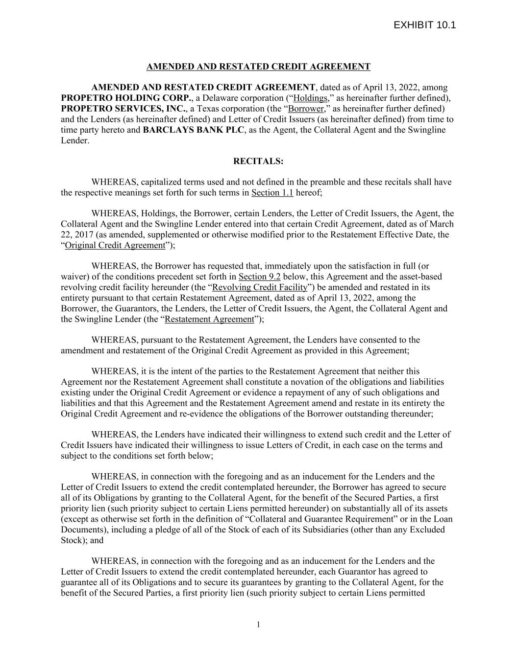 AMENDED AND RESTATED CREDIT AGREEMENT AMENDED AND RESTATED CREDIT AGREEMENT, dated as of April 13, 2022, among PROPETRO HOLDING CORP., a Delaware corporation (“Holdings,” as hereinafter further defined), PROPETRO SERVICES, INC., a Texas corporation (the “Borrower,” as hereinafter further defined) and the Lenders (as hereinafter defined) and Letter of Credit Issuers (as hereinafter defined) from time to time party hereto and BARCLAYS BANK PLC, as the Agent, the Collateral Agent and the Swingline Lender. RECITALS: WHEREAS, capitalized terms used and not defined in the preamble and these recitals shall have the respective meanings set forth for such terms in Section 1.1 hereof; WHEREAS, Holdings, the Borrower, certain Lenders, the Letter of Credit Issuers, the Agent, the Collateral Agent and the Swingline Lender entered into that certain Credit Agreement, dated as of March 22, 2017 (as amended, supplemented or otherwise modified prior to the Restatement Effective Date, the “Original Credit Agreement”); WHEREAS, the Borrower has requested that, immediately upon the satisfaction in full (or waiver) of the conditions precedent set forth in Section 9.2 below, this Agreement and the asset-based revolving credit facility hereunder (the “Revolving Credit Facility”) be amended and restated in its entirety pursuant to that certain Restatement Agreement, dated as of April 13, 2022, among the Borrower, the Guarantors, the Lenders, the Letter of Credit Issuers, the Agent, the Collateral Agent and the Swingline Lender (the “Restatement Agreement”); WHEREAS, pursuant to the Restatement Agreement, the Lenders have consented to the amendment and restatement of the Original Credit Agreement as provided in this Agreement; WHEREAS, it is the intent of the parties to the Restatement Agreement that neither this Agreement nor the Restatement Agreement shall constitute a novation of the obligations and liabilities existing under the Original Credit Agreement or evidence a repayment of any of such obligations and liabilities and that this Agreement and the Restatement Agreement amend and restate in its entirety the Original Credit Agreement and re-evidence the obligations of the Borrower outstanding thereunder; WHEREAS, the Lenders have indicated their willingness to extend such credit and the Letter of Credit Issuers have indicated their willingness to issue Letters of Credit, in each case on the terms and subject to the conditions set forth below; WHEREAS, in connection with the foregoing and as an inducement for the Lenders and the Letter of Credit Issuers to extend the credit contemplated hereunder, the Borrower has agreed to secure all of its Obligations by granting to the Collateral Agent, for the benefit of the Secured Parties, a first priority lien (such priority subject to certain Liens permitted hereunder) on substantially all of its assets (except as otherwise set forth in the definition of “Collateral and Guarantee Requirement” or in the Loan Documents), including a pledge of all of the Stock of each of its Subsidiaries (other than any Excluded Stock); and WHEREAS, in connection with the foregoing and as an inducement for the Lenders and the Letter of Credit Issuers to extend the credit contemplated hereunder, each Guarantor has agreed to guarantee all of its Obligations and to secure its guarantees by granting to the Collateral Agent, for the benefit of the Secured Parties, a first priority lien (such priority subject to certain Liens permitted 1 EXHIBIT 10.1