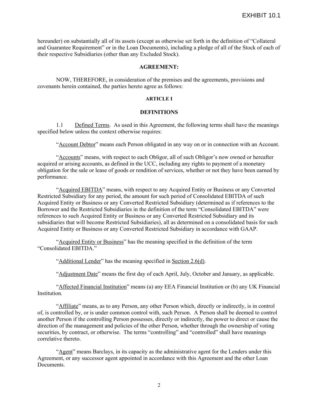 hereunder) on substantially all of its assets (except as otherwise set forth in the definition of “Collateral and Guarantee Requirement” or in the Loan Documents), including a pledge of all of the Stock of each of their respective Subsidiaries (other than any Excluded Stock). AGREEMENT: NOW, THEREFORE, in consideration of the premises and the agreements, provisions and covenants herein contained, the parties hereto agree as follows: ARTICLE I DEFINITIONS 1.1 Defined Terms. As used in this Agreement, the following terms shall have the meanings specified below unless the context otherwise requires: “Account Debtor” means each Person obligated in any way on or in connection with an Account. “Accounts” means, with respect to each Obligor, all of such Obligor’s now owned or hereafter acquired or arising accounts, as defined in the UCC, including any rights to payment of a monetary obligation for the sale or lease of goods or rendition of services, whether or not they have been earned by performance. “Acquired EBITDA” means, with respect to any Acquired Entity or Business or any Converted Restricted Subsidiary for any period, the amount for such period of Consolidated EBITDA of such Acquired Entity or Business or any Converted Restricted Subsidiary (determined as if references to the Borrower and the Restricted Subsidiaries in the definition of the term “Consolidated EBITDA” were references to such Acquired Entity or Business or any Converted Restricted Subsidiary and its subsidiaries that will become Restricted Subsidiaries), all as determined on a consolidated basis for such Acquired Entity or Business or any Converted Restricted Subsidiary in accordance with GAAP. “Acquired Entity or Business” has the meaning specified in the definition of the term “Consolidated EBITDA.” “Additional Lender” has the meaning specified in Section 2.6(d). “Adjustment Date” means the first day of each April, July, October and January, as applicable. “Affected Financial Institution” means (a) any EEA Financial Institution or (b) any UK Financial Institution. “Affiliate” means, as to any Person, any other Person which, directly or indirectly, is in control of, is controlled by, or is under common control with, such Person. A Person shall be deemed to control another Person if the controlling Person possesses, directly or indirectly, the power to direct or cause the direction of the management and policies of the other Person, whether through the ownership of voting securities, by contract, or otherwise. The terms “controlling” and “controlled” shall have meanings correlative thereto. “Agent” means Barclays, in its capacity as the administrative agent for the Lenders under this Agreement, or any successor agent appointed in accordance with this Agreement and the other Loan Documents. 2 EXHIBIT 10.1