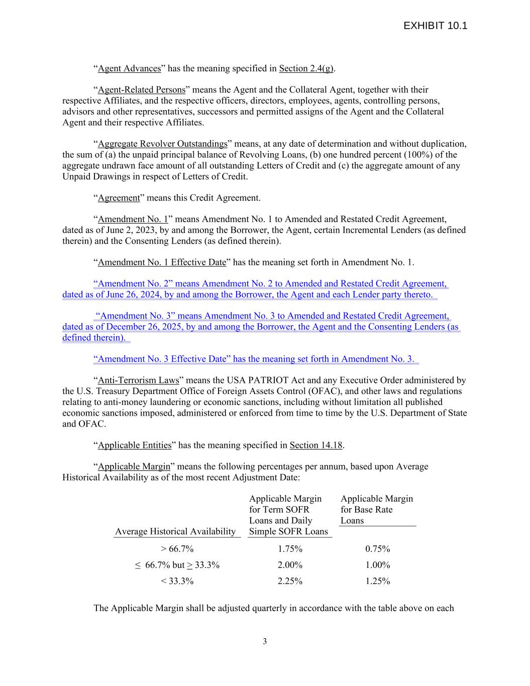 3 0.75% Applicable Margin for Term SOFR Loans and Daily Simple SOFR Loans “Agent Advances” has the meaning specified in Section 2.4(g). “Agent-Related Persons” means the Agent and the Collateral Agent, together with their respective Affiliates, and the respective officers, directors, employees, agents, controlling persons, advisors and other representatives, successors and permitted assigns of the Agent and the Collateral Agent and their respective Affiliates. “Aggregate Revolver Outstandings” means, at any date of determination and without duplication, the sum of (a) the unpaid principal balance of Revolving Loans, (b) one hundred percent (100%) of the aggregate undrawn face amount of all outstanding Letters of Credit and (c) the aggregate amount of any Unpaid Drawings in respect of Letters of Credit. “Agreement” means this Credit Agreement. “Amendment No. 1” means Amendment No. 1 to Amended and Restated Credit Agreement, dated as of June 2, 2023, by and among the Borrower, the Agent, certain Incremental Lenders (as defined therein) and the Consenting Lenders (as defined therein). “Amendment No. 1 Effective Date” has the meaning set forth in Amendment No. 1. “Amendment No. 2” means Amendment No. 2 to Amended and Restated Credit Agreement, dated as of June 26, 2024, by and among the Borrower, the Agent and each Lender party thereto. “Amendment No. 3” means Amendment No. 3 to Amended and Restated Credit Agreement, dated as of December 26, 2025, by and among the Borrower, the Agent and the Consenting Lenders (as defined therein). “Amendment No. 3 Effective Date” has the meaning set forth in Amendment No. 3. “Anti-Terrorism Laws” means the USA PATRIOT Act and any Executive Order administered by the U.S. Treasury Department Office of Foreign Assets Control (OFAC), and other laws and regulations relating to anti-money laundering or economic sanctions, including without limitation all published economic sanctions imposed, administered or enforced from time to time by the U.S. Department of State and OFAC. “Applicable Entities” has the meaning specified in Section 14.18. “Applicable Margin” means the following percentages per annum, based upon Average Historical Availability as of the most recent Adjustment Date: ≤ 66.7% but > 33.3% Applicable Margin for Base Rate Loans 2.00% 1.00% < 33.3% ˃ 66.7% 2.25% Average Historical Availability 1.25% 1.75% The Applicable Margin shall be adjusted quarterly in accordance with the table above on each EXHIBIT 10.1