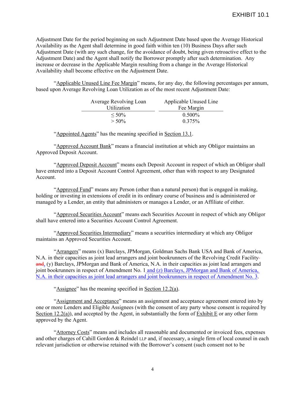 4 ≤ 50% 0.500% Average Revolving Loan Utilization ˃ 50% Applicable Unused Line Fee Margin 0.375% Adjustment Date for the period beginning on such Adjustment Date based upon the Average Historical Availability as the Agent shall determine in good faith within ten (10) Business Days after such Adjustment Date (with any such change, for the avoidance of doubt, being given retroactive effect to the Adjustment Date) and the Agent shall notify the Borrower promptly after such determination. Any increase or decrease in the Applicable Margin resulting from a change in the Average Historical Availability shall become effective on the Adjustment Date. “Applicable Unused Line Fee Margin” means, for any day, the following percentages per annum, based upon Average Revolving Loan Utilization as of the most recent Adjustment Date: “Appointed Agents” has the meaning specified in Section 13.1. “Approved Account Bank” means a financial institution at which any Obligor maintains an Approved Deposit Account. “Approved Deposit Account” means each Deposit Account in respect of which an Obligor shall have entered into a Deposit Account Control Agreement, other than with respect to any Designated Account. “Approved Fund” means any Person (other than a natural person) that is engaged in making, holding or investing in extensions of credit in its ordinary course of business and is administered or managed by a Lender, an entity that administers or manages a Lender, or an Affiliate of either. “Approved Securities Account” means each Securities Account in respect of which any Obligor shall have entered into a Securities Account Control Agreement. “Approved Securities Intermediary” means a securities intermediary at which any Obligor maintains an Approved Securities Account. “Arrangers” means (x) Barclays, JPMorgan, Goldman Sachs Bank USA and Bank of America, N.A. in their capacities as joint lead arrangers and joint bookrunners of the Revolving Credit Facility and, (y) Barclays, JPMorgan and Bank of America, N.A. in their capacities as joint lead arrangers and joint bookrunners in respect of Amendment No. 1 and (z) Barclays, JPMorgan and Bank of America, N.A. in their capacities as joint lead arrangers and joint bookrunners in respect of Amendment No. 3. “Assignee” has the meaning specified in Section 12.2(a). “Assignment and Acceptance” means an assignment and acceptance agreement entered into by one or more Lenders and Eligible Assignees (with the consent of any party whose consent is required by Section 12.2(a)), and accepted by the Agent, in substantially the form of Exhibit E or any other form approved by the Agent. “Attorney Costs” means and includes all reasonable and documented or invoiced fees, expenses and other charges of Cahill Gordon & Reindel LLP and, if necessary, a single firm of local counsel in each relevant jurisdiction or otherwise retained with the Borrower’s consent (such consent not to be EXHIBIT 10.1