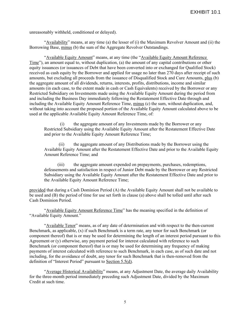 unreasonably withheld, conditioned or delayed). “Availability” means, at any time (a) the lesser of (i) the Maximum Revolver Amount and (ii) the Borrowing Base, minus (b) the sum of the Aggregate Revolver Outstandings. “Available Equity Amount” means, at any time (the “Available Equity Amount Reference Time”), an amount equal to, without duplication, (a) the amount of any capital contributions or other equity issuances (or issuances of Debt that have been converted into or exchanged for Qualified Stock) received as cash equity by the Borrower and applied for usage no later than 270 days after receipt of such amounts, but excluding all proceeds from the issuance of Disqualified Stock and Cure Amounts, plus (b) the aggregate amount of all dividends, returns, interests, profits, distributions, income and similar amounts (in each case, to the extent made in cash or Cash Equivalents) received by the Borrower or any Restricted Subsidiary on Investments made using the Available Equity Amount during the period from and including the Business Day immediately following the Restatement Effective Date through and including the Available Equity Amount Reference Time, minus (c) the sum, without duplication, and, without taking into account the proposed portion of the Available Equity Amount calculated above to be used at the applicable Available Equity Amount Reference Time, of: (i) the aggregate amount of any Investments made by the Borrower or any Restricted Subsidiary using the Available Equity Amount after the Restatement Effective Date and prior to the Available Equity Amount Reference Time; (ii) the aggregate amount of any Distributions made by the Borrower using the Available Equity Amount after the Restatement Effective Date and prior to the Available Equity Amount Reference Time; and (iii) the aggregate amount expended on prepayments, purchases, redemptions, defeasements and satisfaction in respect of Junior Debt made by the Borrower or any Restricted Subsidiary using the Available Equity Amount after the Restatement Effective Date and prior to the Available Equity Amount Reference Time; provided that during a Cash Dominion Period (A) the Available Equity Amount shall not be available to be used and (B) the period of time for use set forth in clause (a) above shall be tolled until after such Cash Dominion Period. “Available Equity Amount Reference Time” has the meaning specified in the definition of “Available Equity Amount.” “Available Tenor” means, as of any date of determination and with respect to the then-current Benchmark, as applicable, (x) if such Benchmark is a term rate, any tenor for such Benchmark (or component thereof) that is or may be used for determining the length of an interest period pursuant to this Agreement or (y) otherwise, any payment period for interest calculated with reference to such Benchmark (or component thereof) that is or may be used for determining any frequency of making payments of interest calculated with reference to such Benchmark, in each case, as of such date and not including, for the avoidance of doubt, any tenor for such Benchmark that is then-removed from the definition of “Interest Period” pursuant to Section 5.5(d). “Average Historical Availability” means, at any Adjustment Date, the average daily Availability for the three-month period immediately preceding such Adjustment Date, divided by the Maximum Credit at such time. 5 EXHIBIT 10.1