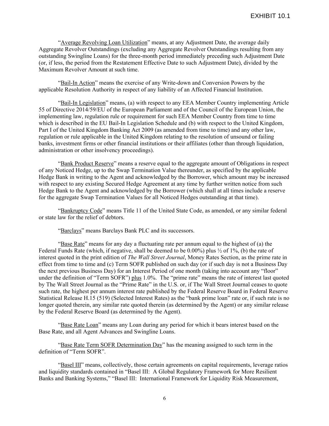 “Average Revolving Loan Utilization” means, at any Adjustment Date, the average daily Aggregate Revolver Outstandings (excluding any Aggregate Revolver Outstandings resulting from any outstanding Swingline Loans) for the three-month period immediately preceding such Adjustment Date (or, if less, the period from the Restatement Effective Date to such Adjustment Date), divided by the Maximum Revolver Amount at such time. “Bail-In Action” means the exercise of any Write-down and Conversion Powers by the applicable Resolution Authority in respect of any liability of an Affected Financial Institution. “Bail-In Legislation” means, (a) with respect to any EEA Member Country implementing Article 55 of Directive 2014/59/EU of the European Parliament and of the Council of the European Union, the implementing law, regulation rule or requirement for such EEA Member Country from time to time which is described in the EU Bail-In Legislation Schedule and (b) with respect to the United Kingdom, Part I of the United Kingdom Banking Act 2009 (as amended from time to time) and any other law, regulation or rule applicable in the United Kingdom relating to the resolution of unsound or failing banks, investment firms or other financial institutions or their affiliates (other than through liquidation, administration or other insolvency proceedings). “Bank Product Reserve” means a reserve equal to the aggregate amount of Obligations in respect of any Noticed Hedge, up to the Swap Termination Value thereunder, as specified by the applicable Hedge Bank in writing to the Agent and acknowledged by the Borrower, which amount may be increased with respect to any existing Secured Hedge Agreement at any time by further written notice from such Hedge Bank to the Agent and acknowledged by the Borrower (which shall at all times include a reserve for the aggregate Swap Termination Values for all Noticed Hedges outstanding at that time). “Bankruptcy Code” means Title 11 of the United State Code, as amended, or any similar federal or state law for the relief of debtors. “Barclays” means Barclays Bank PLC and its successors. “Base Rate” means for any day a fluctuating rate per annum equal to the highest of (a) the Federal Funds Rate (which, if negative, shall be deemed to be 0.00%) plus ½ of 1%, (b) the rate of interest quoted in the print edition of The Wall Street Journal, Money Rates Section, as the prime rate in effect from time to time and (c) Term SOFR published on such day (or if such day is not a Business Day the next previous Business Day) for an Interest Period of one month (taking into account any “floor” under the definition of “Term SOFR”) plus 1.0%. The “prime rate” means the rate of interest last quoted by The Wall Street Journal as the “Prime Rate” in the U.S. or, if The Wall Street Journal ceases to quote such rate, the highest per annum interest rate published by the Federal Reserve Board in Federal Reserve Statistical Release H.15 (519) (Selected Interest Rates) as the “bank prime loan” rate or, if such rate is no longer quoted therein, any similar rate quoted therein (as determined by the Agent) or any similar release by the Federal Reserve Board (as determined by the Agent). “Base Rate Loan” means any Loan during any period for which it bears interest based on the Base Rate, and all Agent Advances and Swingline Loans. “Base Rate Term SOFR Determination Day” has the meaning assigned to such term in the definition of “Term SOFR”. “Basel III” means, collectively, those certain agreements on capital requirements, leverage ratios and liquidity standards contained in “Basel III: A Global Regulatory Framework for More Resilient Banks and Banking Systems,” “Basel III: International Framework for Liquidity Risk Measurement, 6 EXHIBIT 10.1